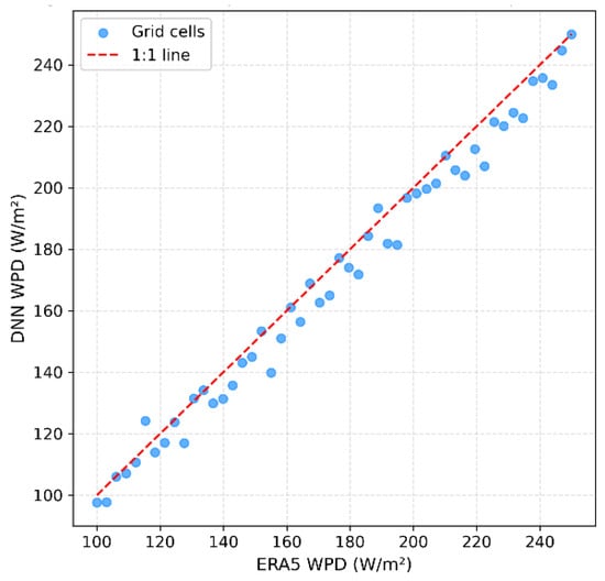 The statistical equivalence between the DNN predictions and ERA5 reference data carries important implications for long-term energy planning. Because the model preserves the intrinsic variability, dispersion, and spatial organization of the reanalysis, its outputs can be used directly within existing planning workflows without recalibration. Importantly, the model enables anticipatory WPD estimation up to two years ahead of the availability of the actual reanalysis products, offering a computationally efficient mechanism for forward-looking assessments under Industry 5.0 planning paradigms. This balance between reproducibility, interpretability, and computational sustainability positions the model as a practical tool for emerging economies [38].