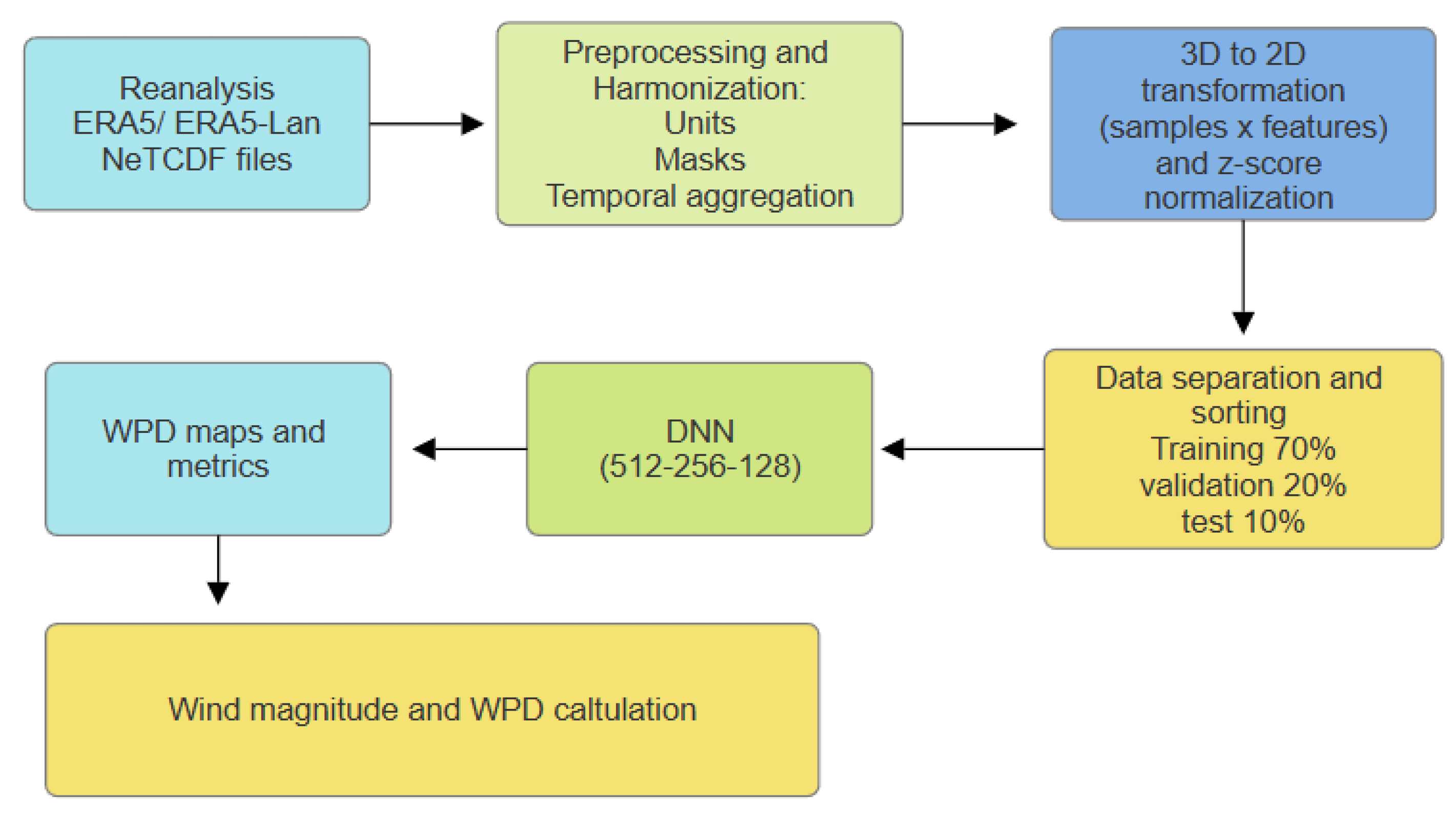 - Develop a reproducible and computationally efficient framework for large-scale wind resource assessment in data-scarce environments.