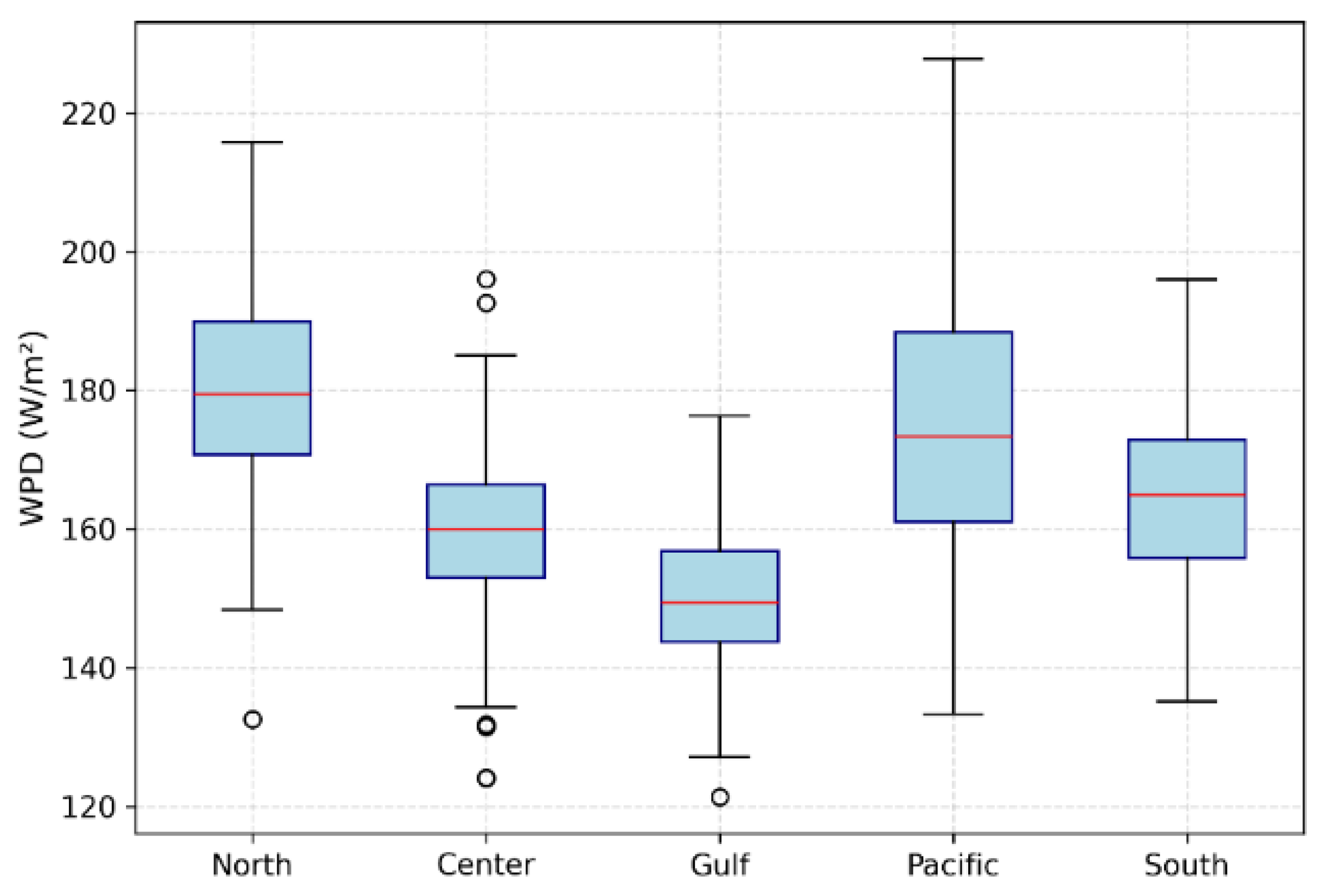 - Villanueva, H.; López, M.; García, J. Wind atlas for Mexico (WAM) Observational Wind Atlas. DTU Wind Energy. 2022. Available online: https://orbit.dtu.dk/en/publications/wind-atlas-for-mexico-wam-observational-wind-atlas (accessed on 2 November 2025).