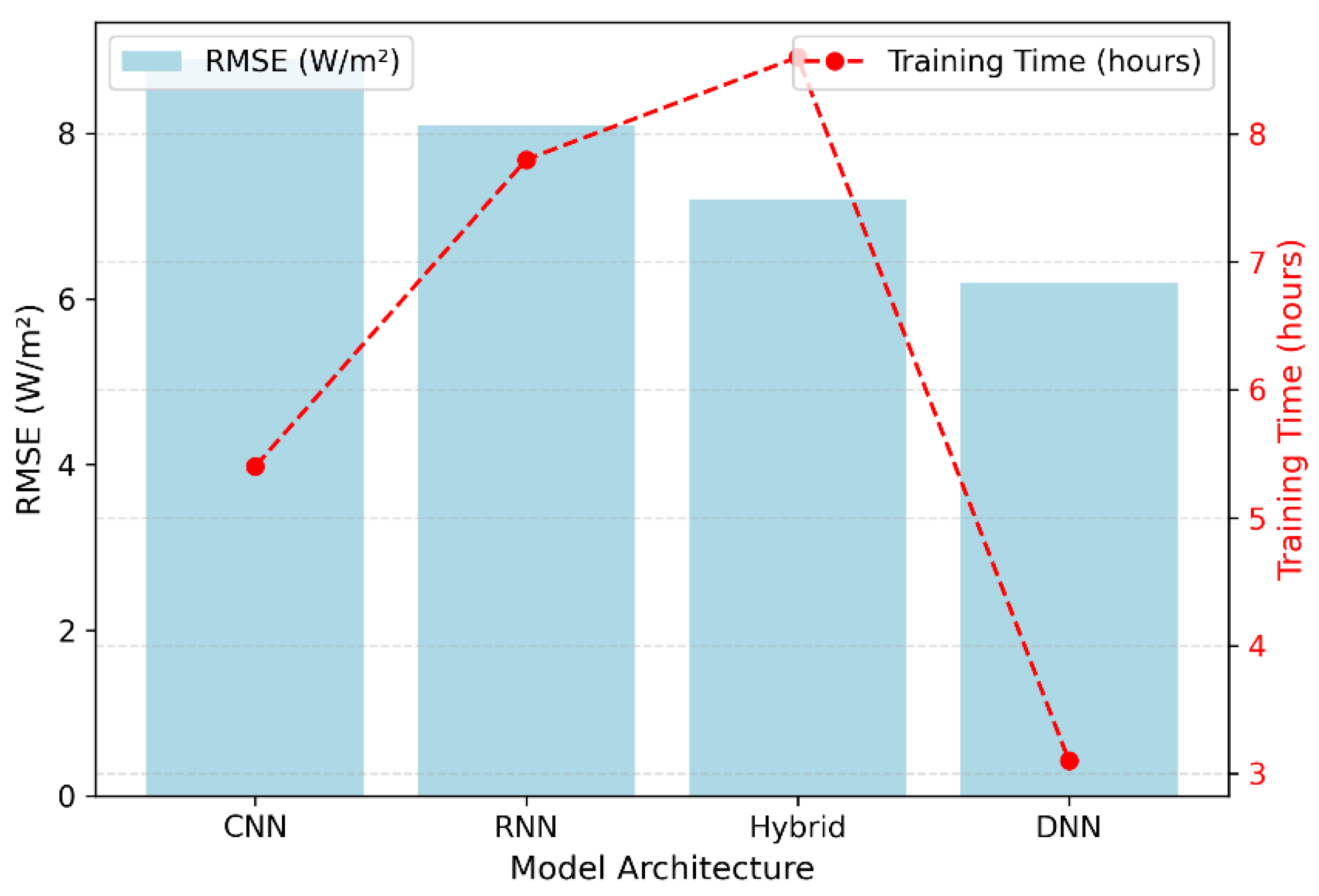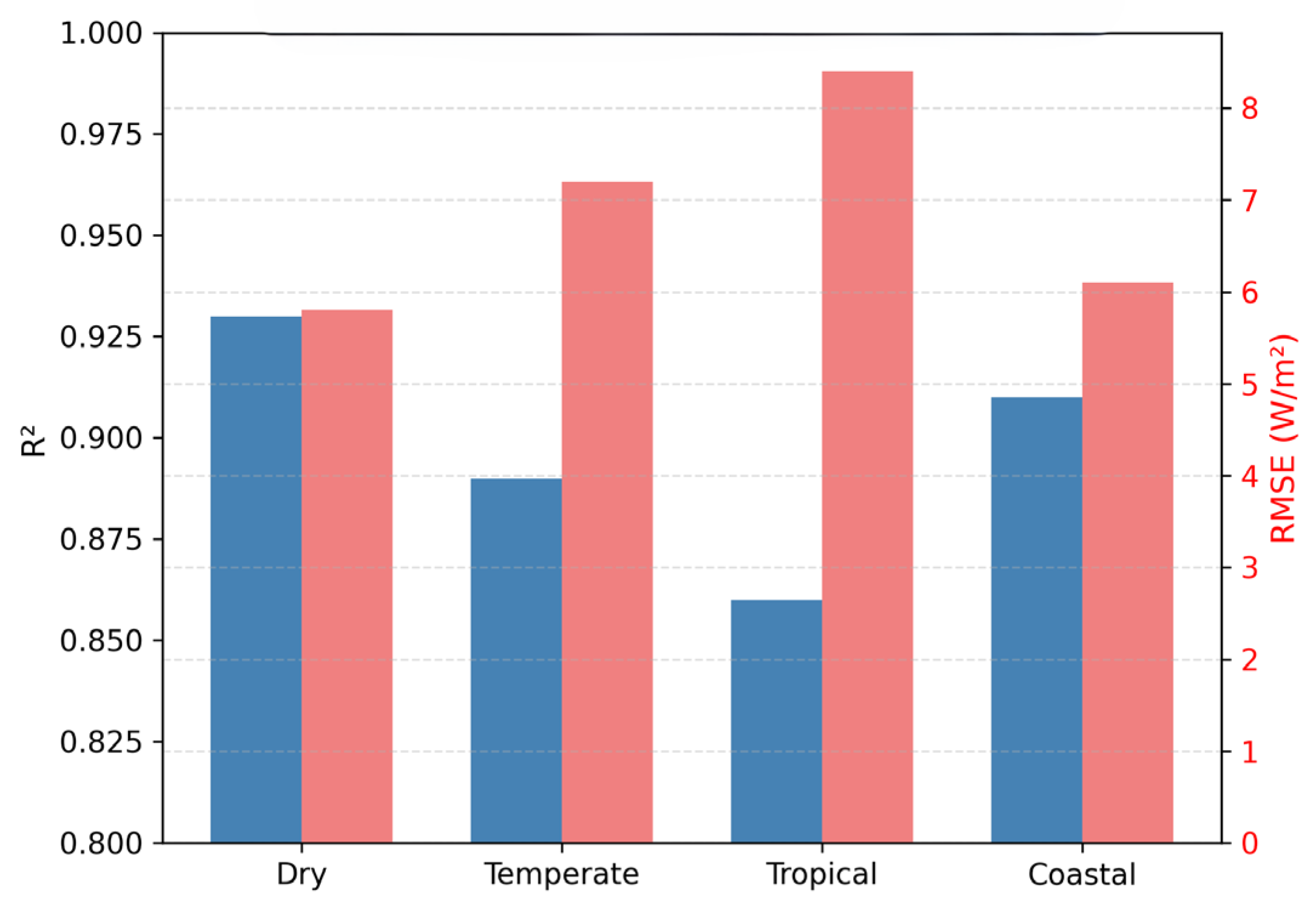 | Model | Architecture | R2 | RMSE (W/m2) | MAE (W/m2) | Training Time (h) | Energy (kWh) | Relative Energy Use (%) |