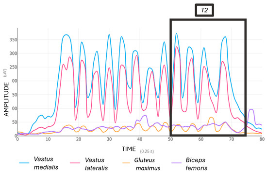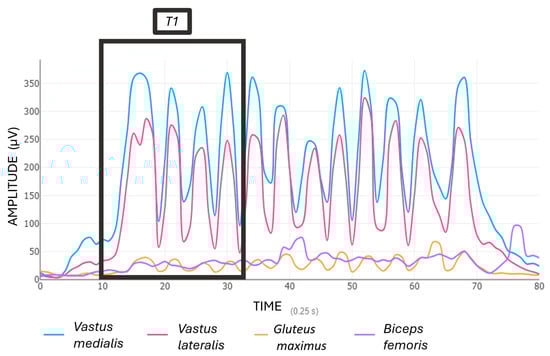 Muscle activation was recorded using a validated surface electromyography system (mDurance®, mDurance Solutions S.L., Granada, Spain) [29]. Signals were acquired and stored using the manufacturer’s application and web platform; processing and signal-conditioning were performed following the device’s validated pipeline.