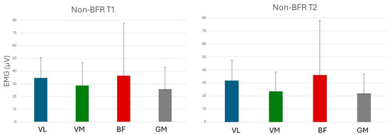 Figure 7 and Figure 8 show mean values of electromyographically measured muscle activation at T1 and T2 in experiments with BFR and non-BFR, respectively.