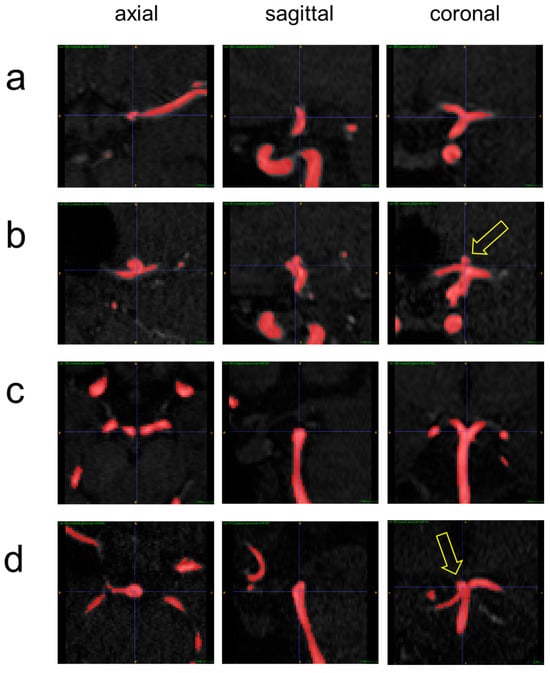 Mid-axial, mid-sagittal, and mid-coronal slices of the 3D patches with the dimensions of 64 × 64 × 64. The bifurcations are located at the centers of the 3D patches. (a). Subject A’s L-ICA bifurcation region of interest, with no aneurysm. (b). Subject B’s L-ICA bifurcation region of interest, with aneurysm indicated by the yellow arrow. (c). Subject C’s BA bifurcation region of interest, with no aneurysm. (d). Subject D’s BA bifurcation region of interest, with aneurysm indicated by the yellow arrow.