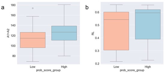 Comparisons between high-probability score and low-probability score groups. (a) Box plot showing A1 + A2 angle differences in groups. (b) Box plot showing relative length (RL) differences in groups.