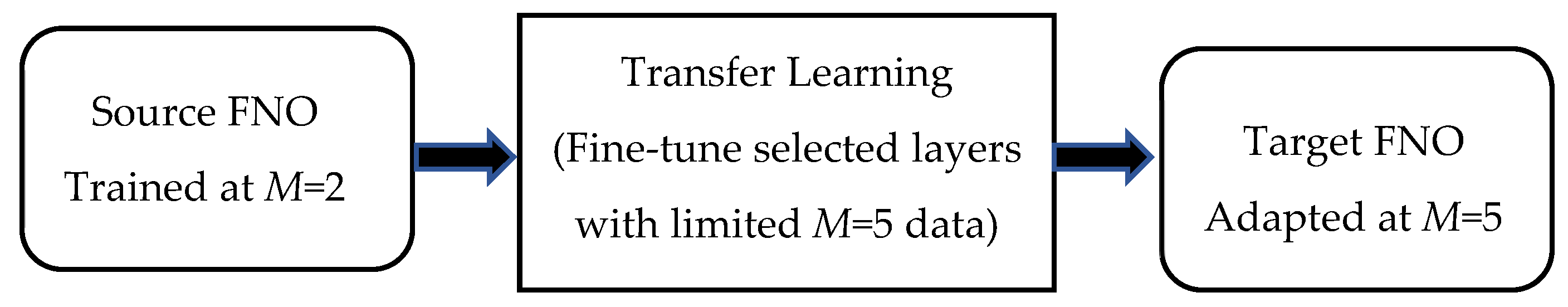 M = 5. This strategy enables reuse of spectral representations already learned in the source model, while freezing all Fourier layers and fine-tuning only parameters at the linear lifting and projection layers with 300 target samples. By doing so, TL-FNO aims to accelerate convergence, reduce data requirements, and enhance extrapolation performance compared with training from scratch.
