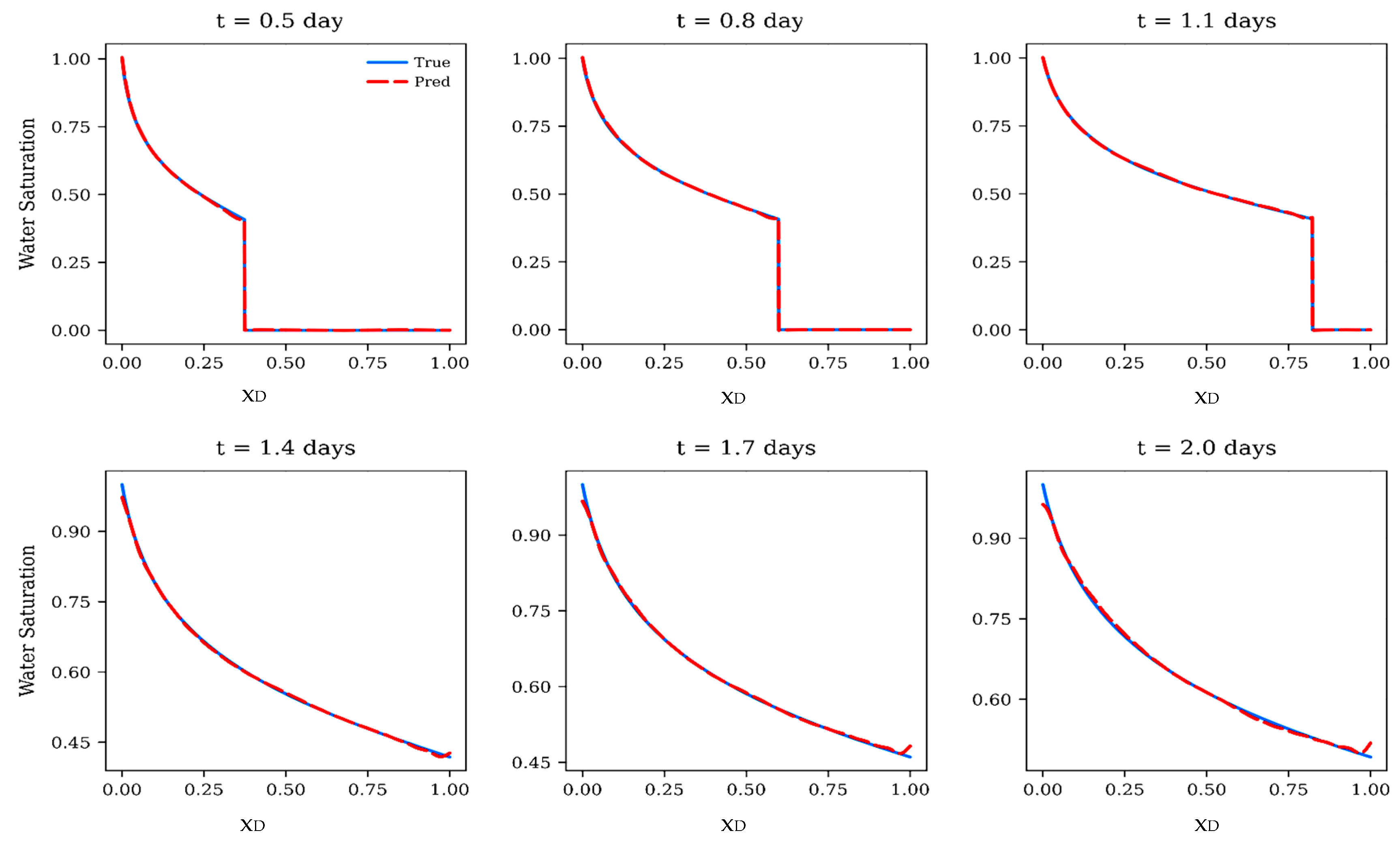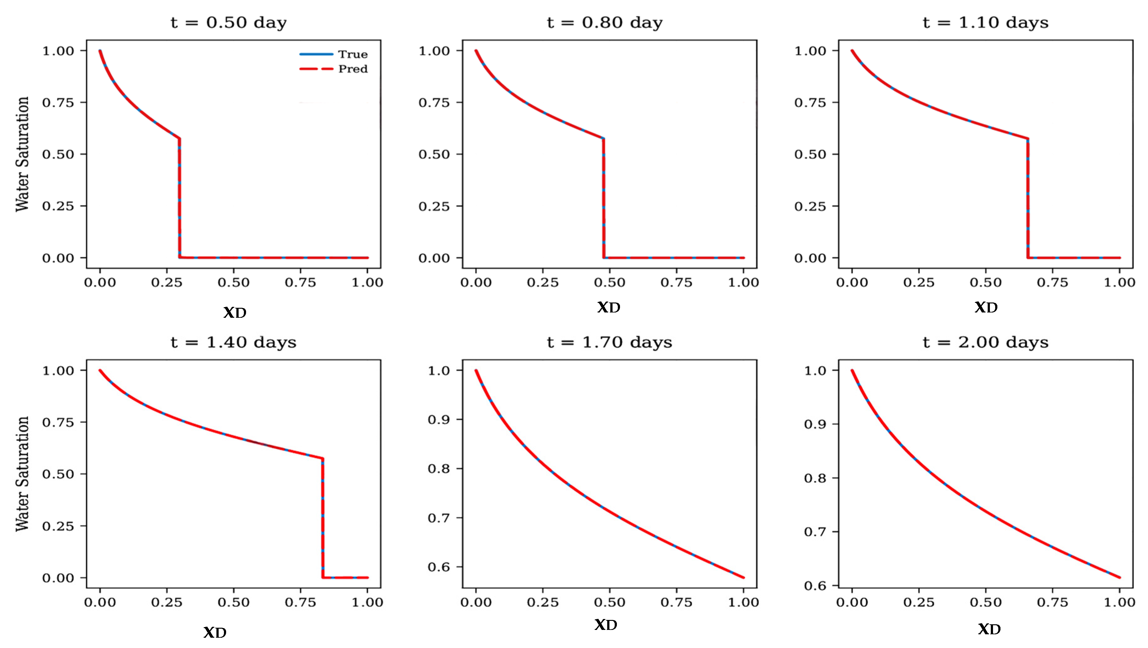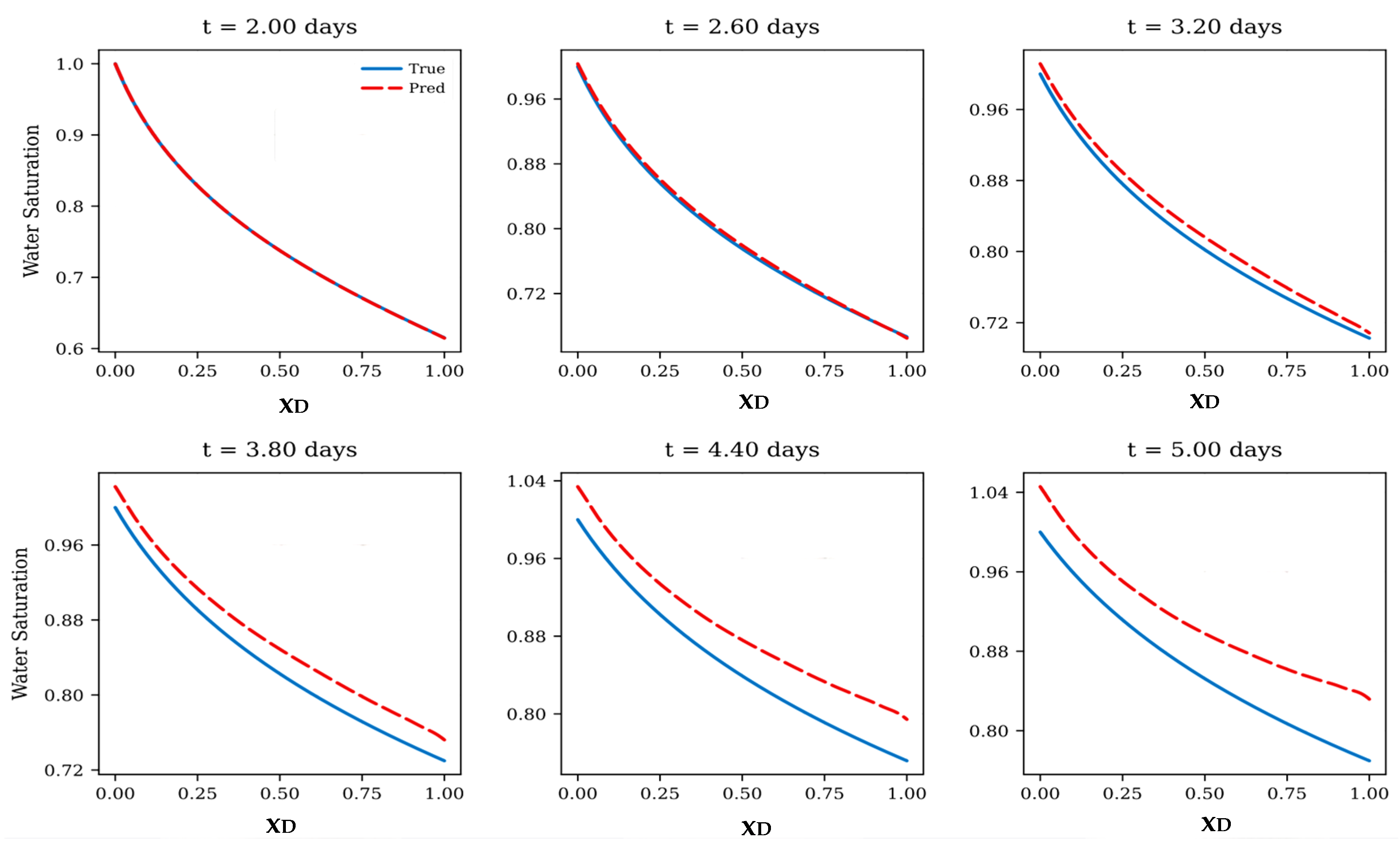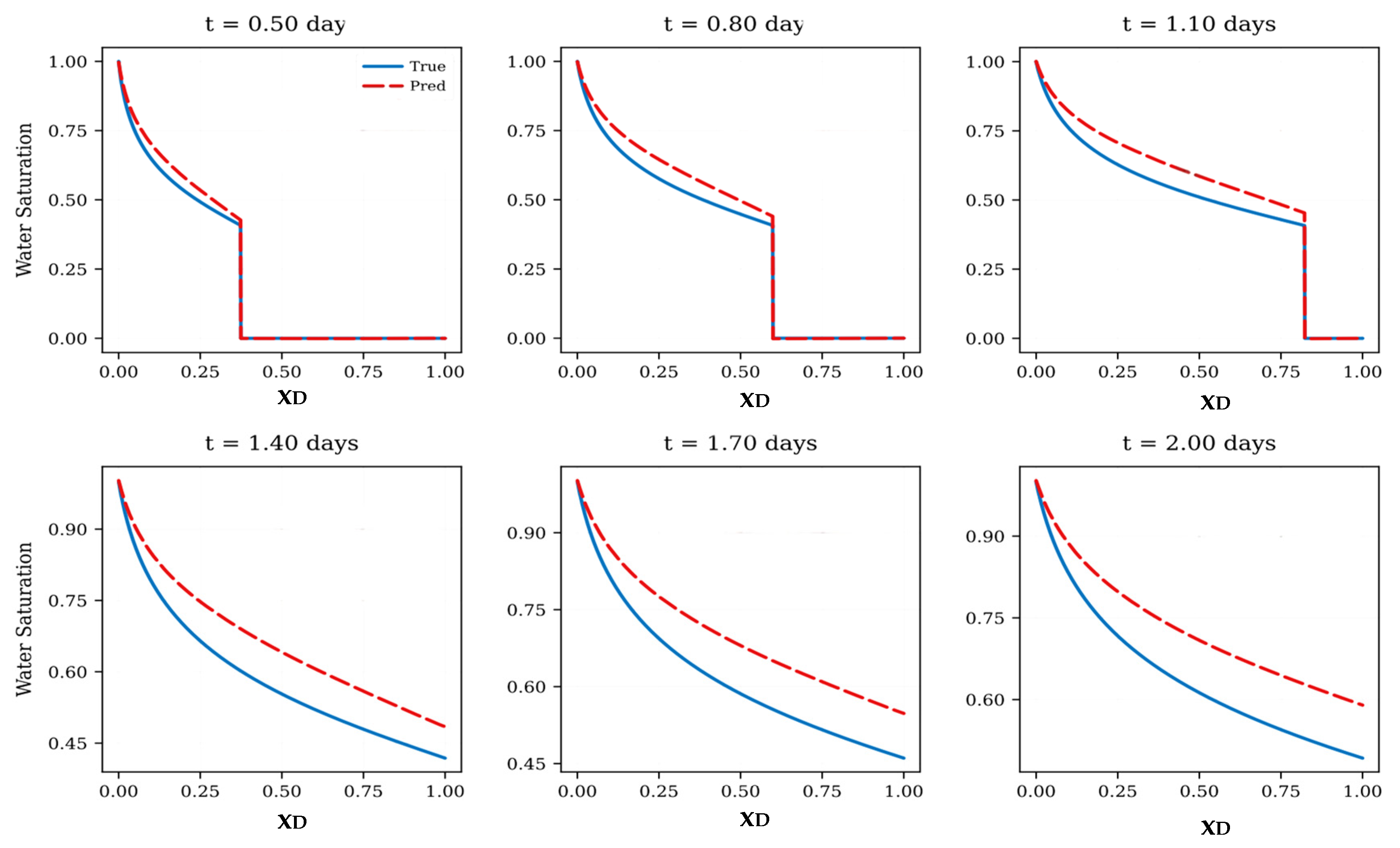 t = 1.4–2.0 days), the discrepancy increases, with the model consistently overestimating water saturation across the domain. The predicted front becomes diffused and lags in representing the strong nonlinear displacement behavior present in the analytical solution.