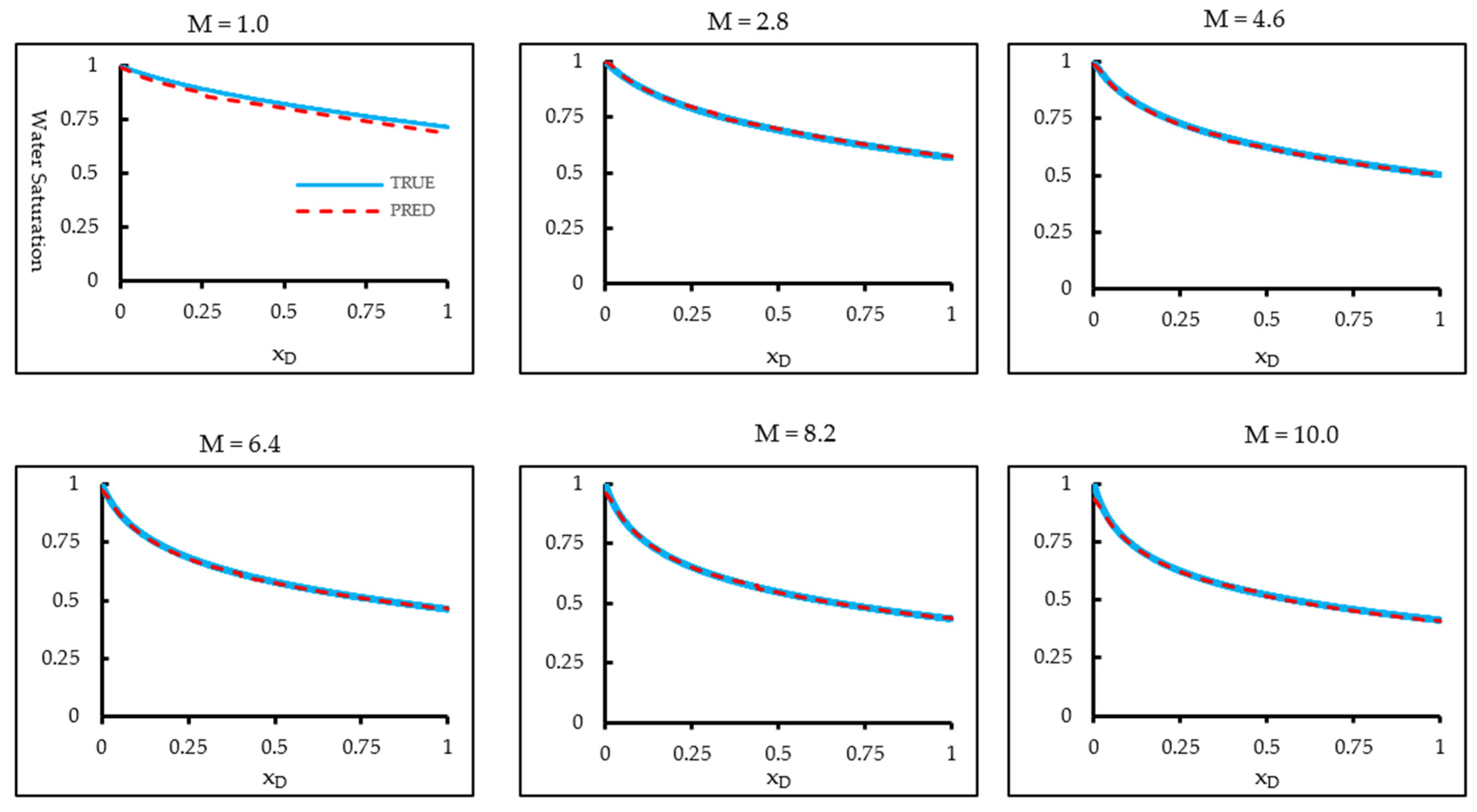 Figure 9 compares the analytical B-L solution with model predictions for extrapolation to mobility ratio M = 15, a regime beyond the training range of [1, 10]. The comparison (