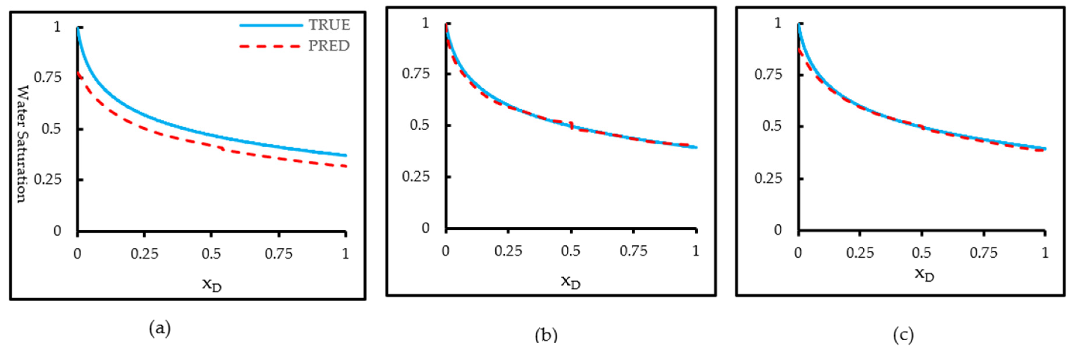 Figure 9a) reveals that the baseline FNO captures the overall decreasing trend of water saturation with distance but exhibits a systematic underestimation across the entire domain. The predicted saturation front is displaced downward, reflecting the model’s inability to replicate the stronger instability and sharper displacement front associated with the higher mobility ratio. This discrepancy indicates that the trained operator, although effective within its original parameter regime, struggles to generalize to more extreme flow contrasts.