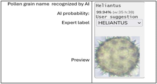 The labeling process was conducted manually, without knowledge of the AI model’s classification results, ensuring the independence of the reference assessment in the context of model validation. Additionally, a dedicated tool for labeling pollen images was developed, accessible via a web browser, which allowed experts to view the AI classification along with the probability value, as well as select and assign their own expert label. An example of this tool’s interface is shown in Figure 1. Although this tool did not influence the reference labeling process in the present study, its application enables further development of a hybrid environment that combines expert knowledge with AI automation.