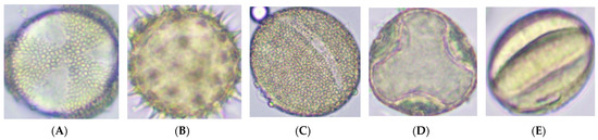 Representative images of pollen grains from the five analysed plant species: (A) Brassica napus—spherical grain, reticulate exine, medium wall thickness; (B) Helianthus annuus—spherical grain with pronounced echinate ornamentation; (C) Fagopyrum esculentum—triangular grain in polar view, reticulate exine; (D) Tilia cordata—spherical tricolpate grain, echinate exine, thick wall; (E) Phacelia tanacetifolia—sphero-ellipsoidal, triporate grain with thin wall.