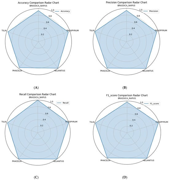From the perspective of practical applications in honey quality control, it is particularly important that precision and F1-score exceeded 0.95 for all five species. This meets typical deployment criteria for systems designed to support expert decision-making in biological image analysis. The resulting accuracy, precision, recall and F1-score values for all five classes are shown in Figure 3A–D, where each metric is presented separately for all plant species.