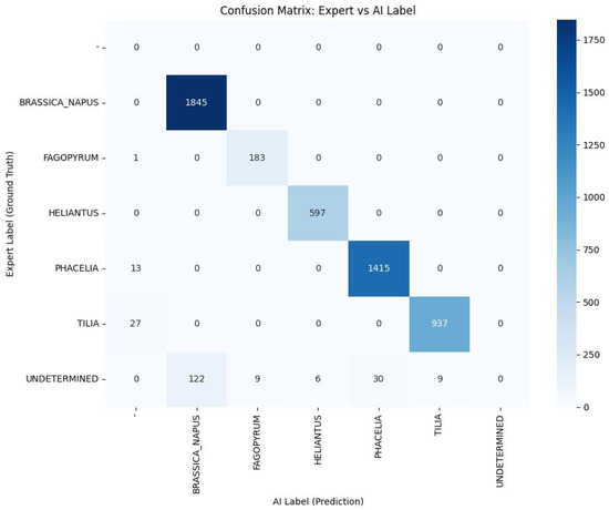 Analysis of the confusion matrix showed that the vast majority of observations were correctly classified, whereas the relatively few errors mainly concerned morphologically challenging cases or those labelled by the expert as “undetermined”. In such situations, the model most frequently assigned labels corresponding to plant species with similar morphological features, which is consistent with palynological intuition. The confusion matrix, presented as a heatmap, is shown in Figure 4 (diagonal elements represent correct classifications, while off-diagonal cells indicate the main directions of misclassification).