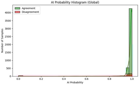 The distribution of prediction probabilities assigned by the model (prediction probability) is shown in Figure 5. A clear difference between the two groups is visible: for classifications concordant with the expert, most values are concentrated close to 1.0, whereas for misclassified cases the distribution of prediction probability is markedly broader with a lower median and a higher proportion of intermediate values. This suggests that the model to a considerable extent reflects the “difficulty” of a given case in its declared confidence level.