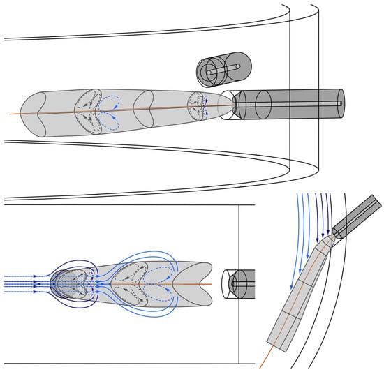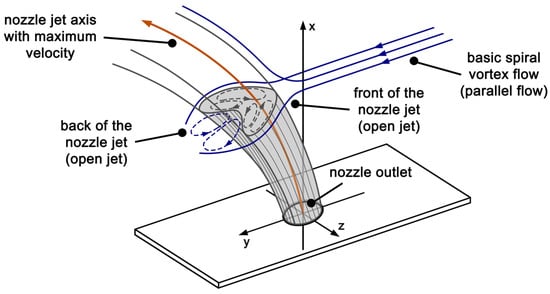 Based on Abramovich’s nozzle jet model [38] and the experimental findings regarding the aerodynamics obtained in the course of this work, a model of the deflected and deformed nozzle jet of the unloaded grinding gas flow in a spiral jet mill is created, as illustrated in Figure 11. After exiting the nozzle outlet and entering the grinding chamber, the nozzle jet initially expands with a circular flow cross-section. As soon as the jet is encountered and deflected by the basic spiral vortex flow, the vortex-pair forms on its back, resulting almost directly in a deformation of the nozzle jet that intensifies with increasing distance from the nozzle outlet. Due to the restriction of the optical accessibility of the grinding chamber by the nozzle borehole in the grinding ring, the circular flow cross-section cannot be captured experimentally (cf. Figure 10), as it rapidly transitions into the kidney-shaped cross-section.