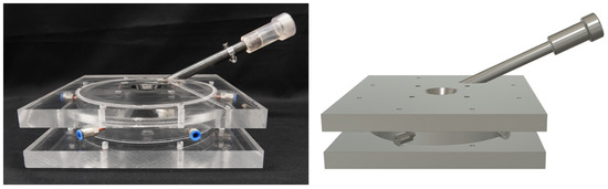 The experimental investigation of the flow conditions inside the spiral jet mill is performed by applying Particle Image Velocimetry (PIV). This non-invasive laser optical measurement method enables the analysis of the two-dimensional velocity fields at different levels within the grinding chamber (planar PIV). For this purpose, a scale-down model of an industrial spiral jet mill with a grinding chamber diameter of 190 mm and a grinding chamber height of 24 mm is used. This model is made of polymethyl methacrylate (PMMA) for the most part and, therefore, almost completely optically accessible (see Figure 2). This characteristic is a mandatory requirement for the application of PIV. The considered mill configuration in this work has a product outlet diameter of 24 mm and is equipped with 6 convergent-cylindrical nozzles at medium height with a minimum diameter of 0.8 mm and a radial angle of 40°.
