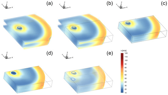 For this purpose, the z-coordinate, defined as the height of the corresponding level, is initially incorporated into the two-dimensional data sets so that the velocity fields from Figure 3 can be represented in three-dimensional space, as illustrated in Figure 4a. Subsequently, the bounding box is determined (see Figure 4b), which encompasses the maximum area of the grinding chamber cross-section in the x- and y-direction, for which meaningful velocity data is available on all levels under consideration. The data outside the confines of the bounding box is deemed unsuitable for the generation of the 3D model due to its incompleteness. Consequently, this data is concealed, as shown in Figure 4c. The flow immediately at the bottom and cover of the grinding chamber (z < 1 mm and z > 23 mm) cannot be experimentally measured or covered by interpolation. In addition, the flow dynamics in this region are already influenced by the specific conditions of the walls, therefore, extrapolating beyond the data sets is not useful. For these reasons, the flow in the region proximate to the walls cannot be taken into account in this study. After defining the dimensions of the bounding box, a corresponding solid body is generated in which the flow velocities between the discrete horizontal levels are completely calculated using the inverse distance interpolation method. Figure 4d,e illustrates the 3D model of the unloaded grinding gas flow created by interpolating between the experimentally examined flow fields. The region for r > 95 mm is concealed within the bounding box, as it is located outside the grinding chamber.