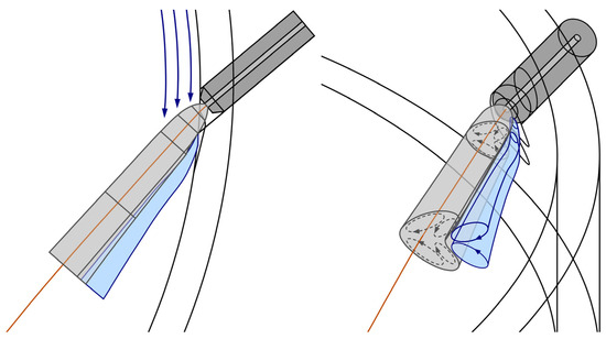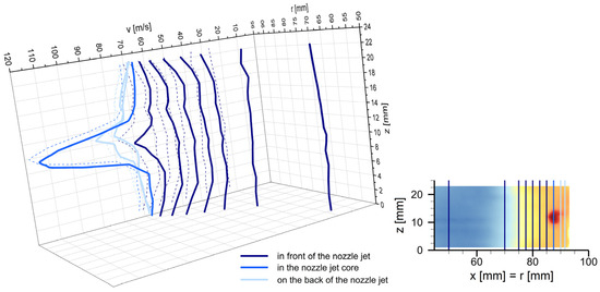 The formation of the two notches through abrasion can be most adequately explained by the two-dimensional velocity field of the particle-loaded grinding gas flow obtained by PIV measurements at the nozzle level, as shown in Figure 13, and the corresponding model of the deflected and deformed nozzle jet, as illustrated in Figure 14.