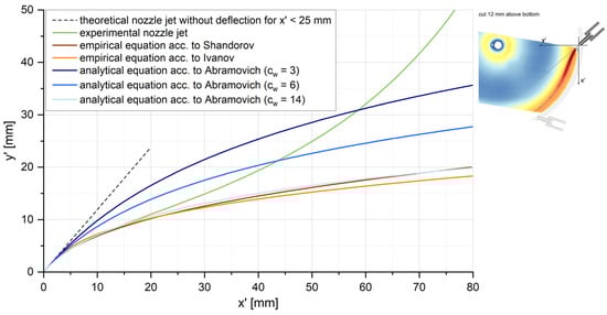 Course of the nozzle jet axis as a result of the deflection by the basic flow—comparison of the experimental data with empirical and analytical equations from the literature according to Equations (2)–(4) (adjusted coordinate system is outlined in the velocity field at nozzle level from Figure 3 at the top right).