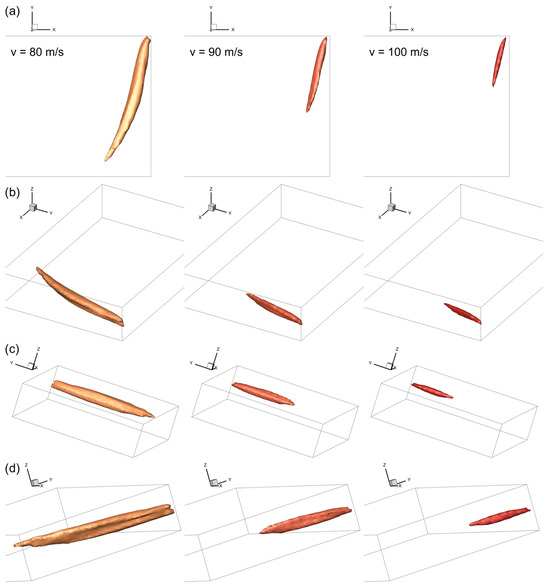 In order to provide a more precise description of the nozzle jet’s shape, a series of iso-surfaces for a velocity limit of v = 80, 90, and 100 m/s is generated from the experimental 3D model, as illustrated in Figure 10 from various perspectives. As the velocity limit increases, the size of the iso-surface decreases according to the established flow pattern, while the shape of the nozzle jet concurrently undergoes a significant change.