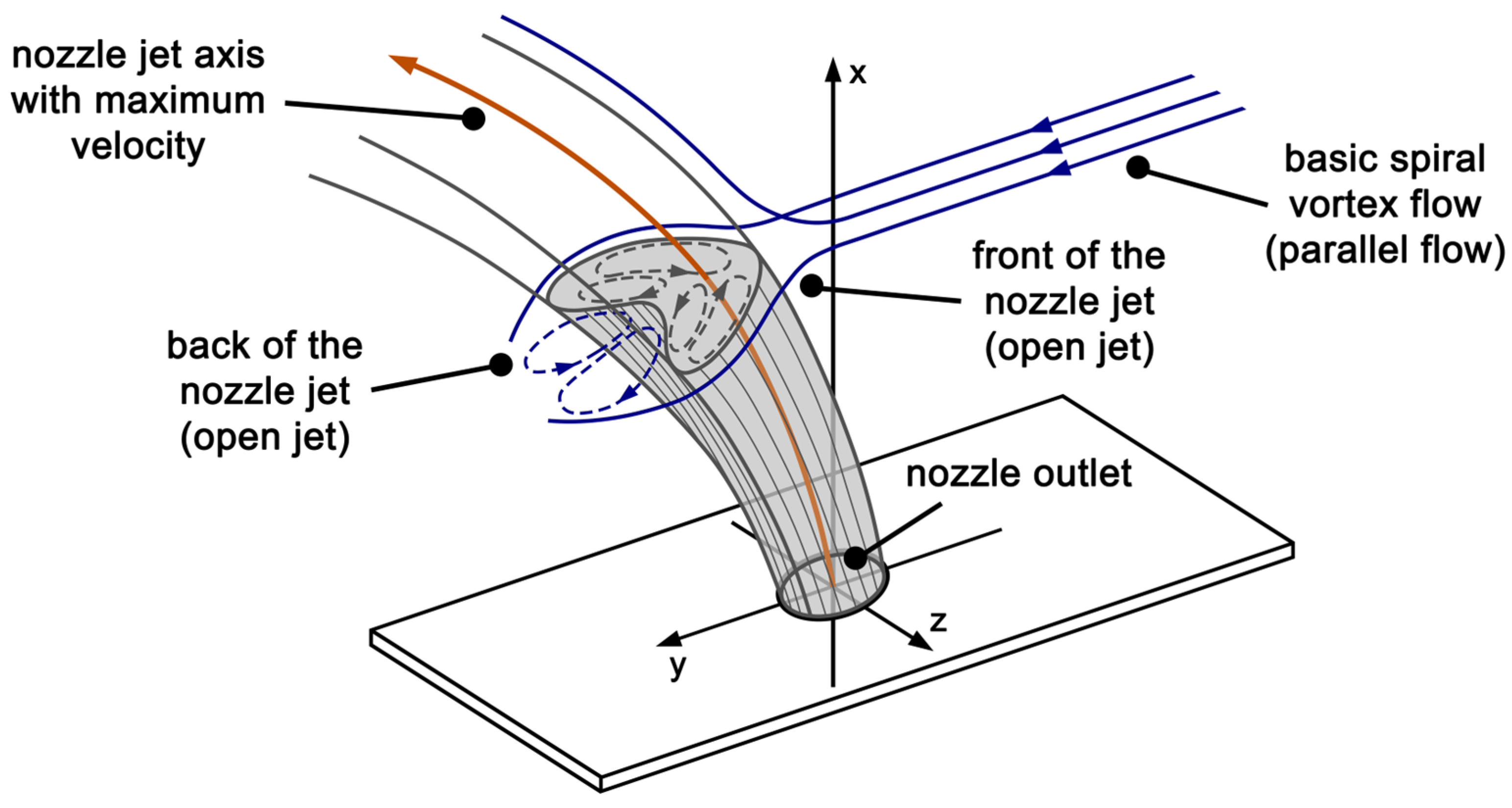 As a consequence of the negative pressure that is accompanied by a strong suction effect and the flow of the vortex-pair, the nozzle jet preferentially aspirates grinding gas from the main flow on its back. In addition, this also induces an internal circulation and thus a strong mixing inside the nozzle jet flow. Due to the influence of the pressure field and the lateral shear forces, increasing distance from the nozzle outlet not only causes a deflection of the nozzle jet in the direction of the basic spiral vortex flow, but also a deformation of the initial circular jet into a kidney-shaped flow cross-section. Therefore, according to Bauer [8], the flow conditions are modified so that the flow resistance increases as the jet deforms more intensely.