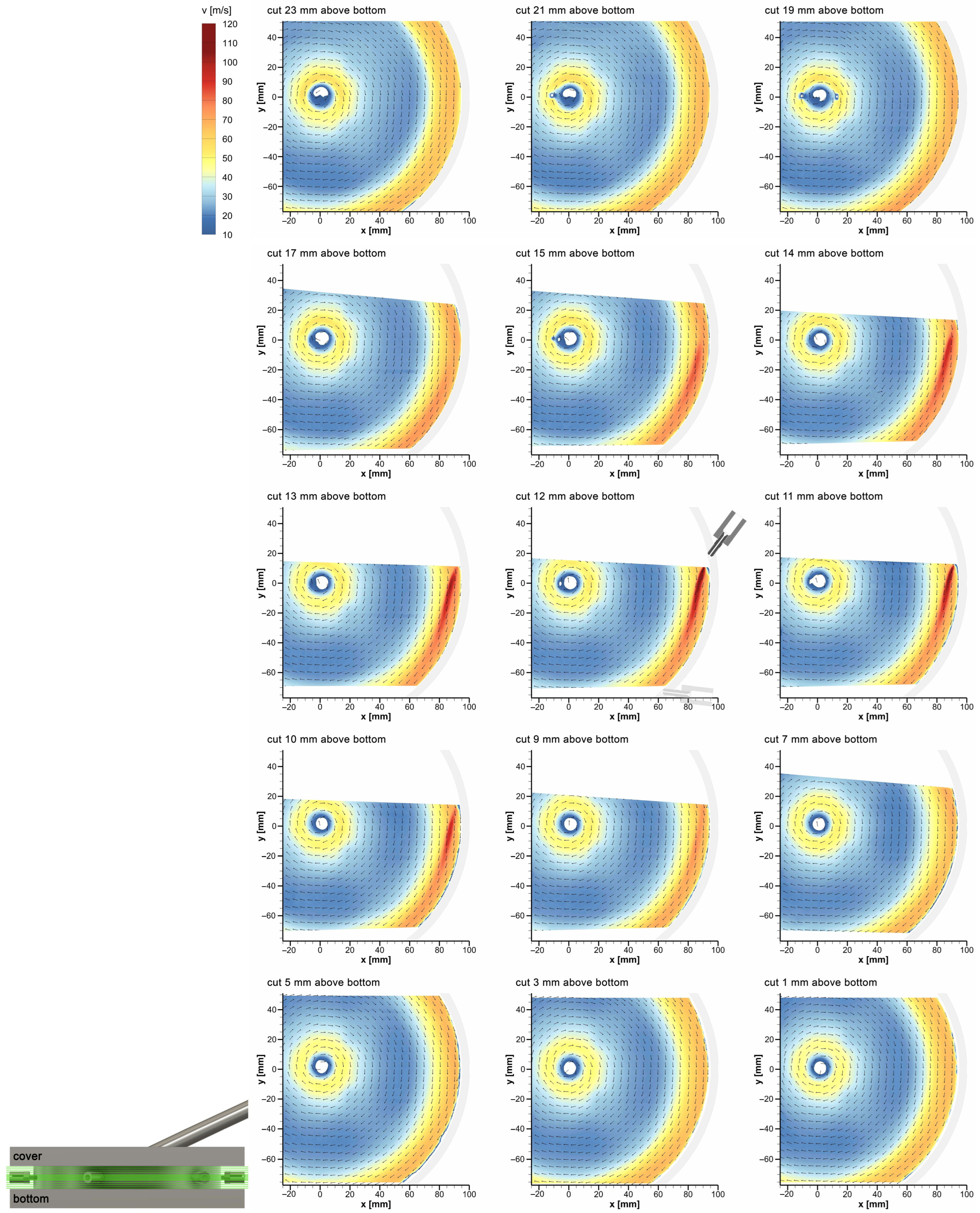 Horizontal velocity fields of the unloaded grinding gas flow obtained by PIV measurements with DEHS as tracer—comparison of different horizontal levels within the grinding chamber at a height of z = 1 to 23 mm above the bottom, as outlined in the CAD model at the bottom left, position and orientation of nozzles are shown in image “cut 12 mm above bottom”.