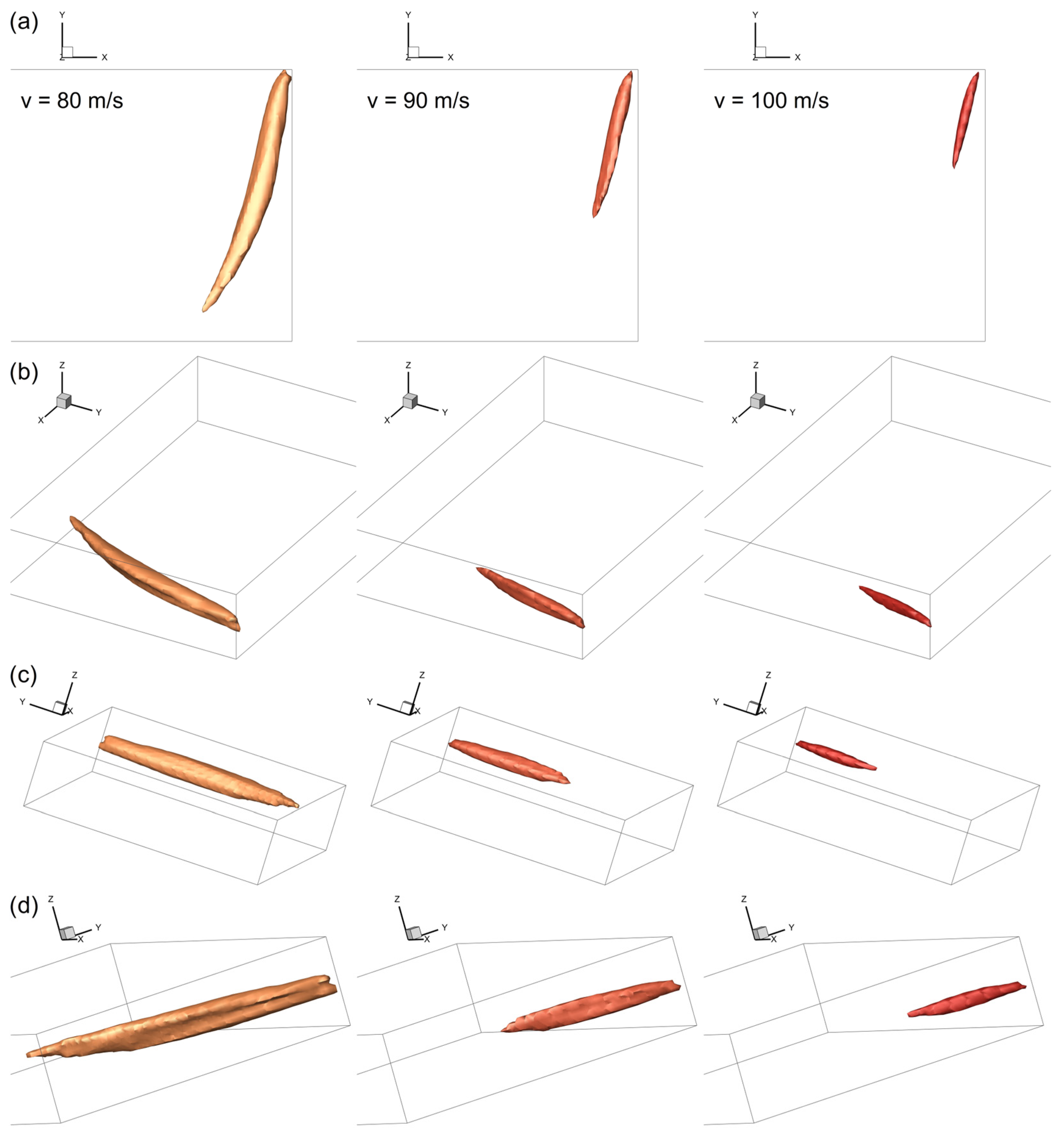 At a velocity limit of v = 90 m/s, the iso-surface continues to exhibit the kidney-shaped flow cross-section. However, this deformation of the cross-section is considerably less pronounced compared to its manifestation at the lower velocity of v = 80 m/s, whereas the shape of the nozzle jet in the flow direction already resembles the shape observed at a velocity of v = 100 m/s.