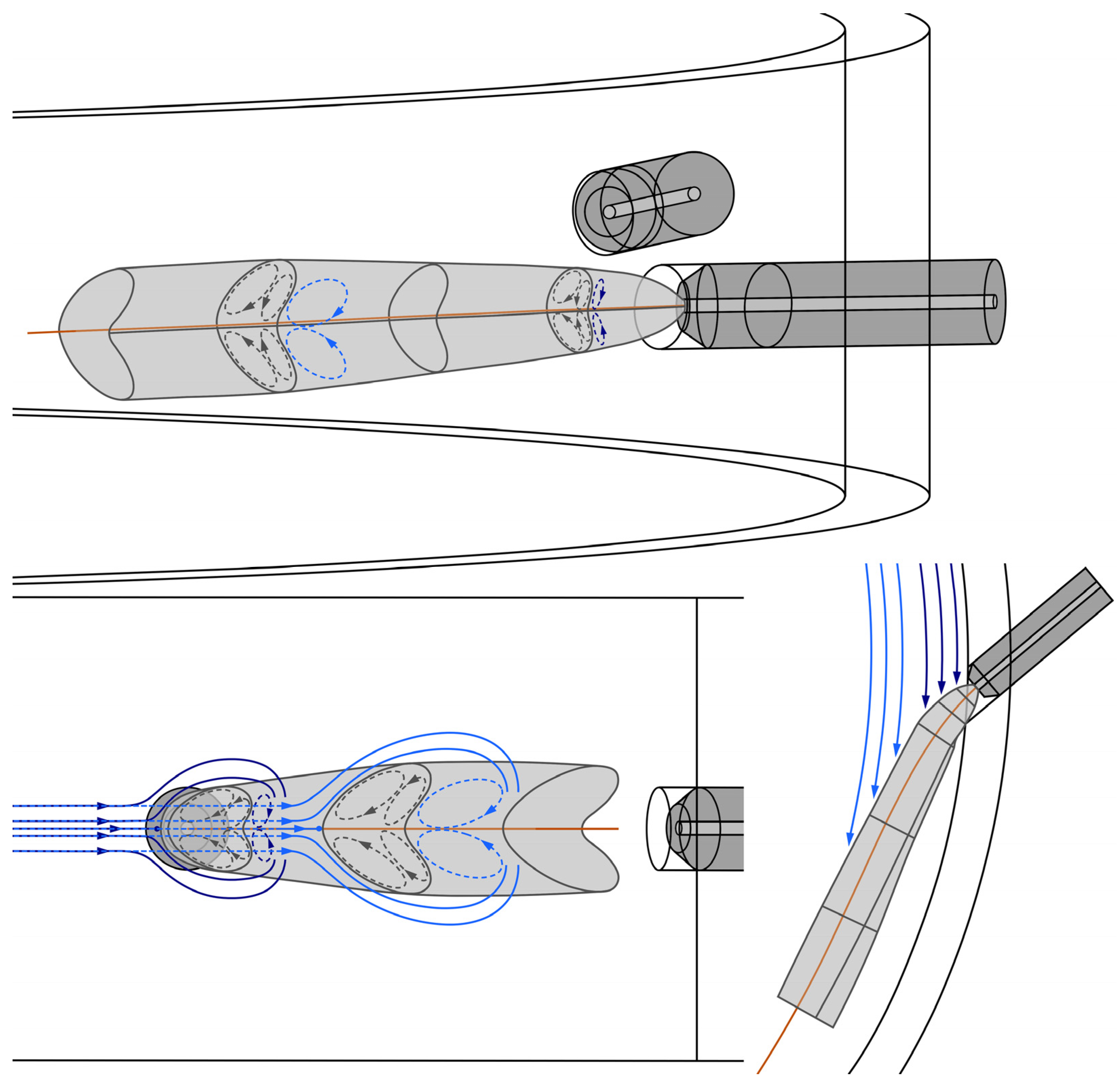 Model of the deflected and deformed nozzle jet of the unloaded grinding gas flow in a spiral jet mill, based on Abramovich’s nozzle jet model, from different perspectives.