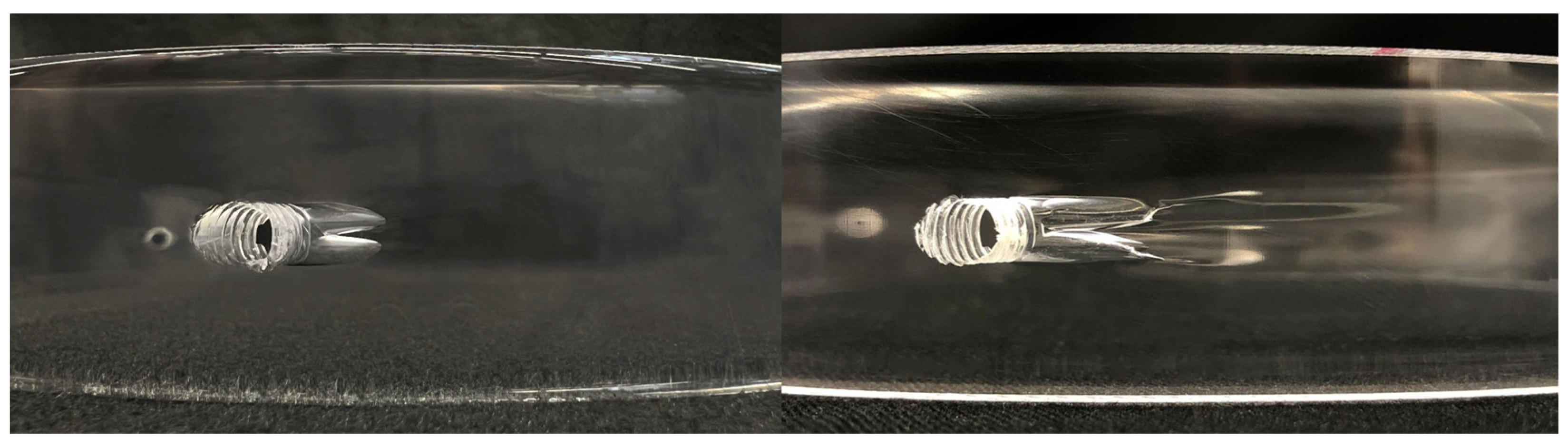 The existence of the vortex pair on the back of the nozzle jet can be confirmed not only through the experimental 3D model of the unloaded grinding gas flow, but also through the observed abrasion on the inner wall of the grinding chamber subsequent to conventional grinding experiments with particle loading, as depicted in Figure 12. Two symmetrical notches are formed behind the nozzle outlet in the direction of flow, whose intensity increases with increasing grinding duration. However, in the mid-range of the nozzle jet at the medium height of the mill, there is negligible abrasion, resulting in the formation of a material bridge that remains even after a long grinding duration. The two notches in the grinding ring each measure approximately 3 to 4 times the height of the nozzle diameter in the case under consideration. A very similar abrasion behavior has also been observed in industrial spiral jet mills made of metallic materials.