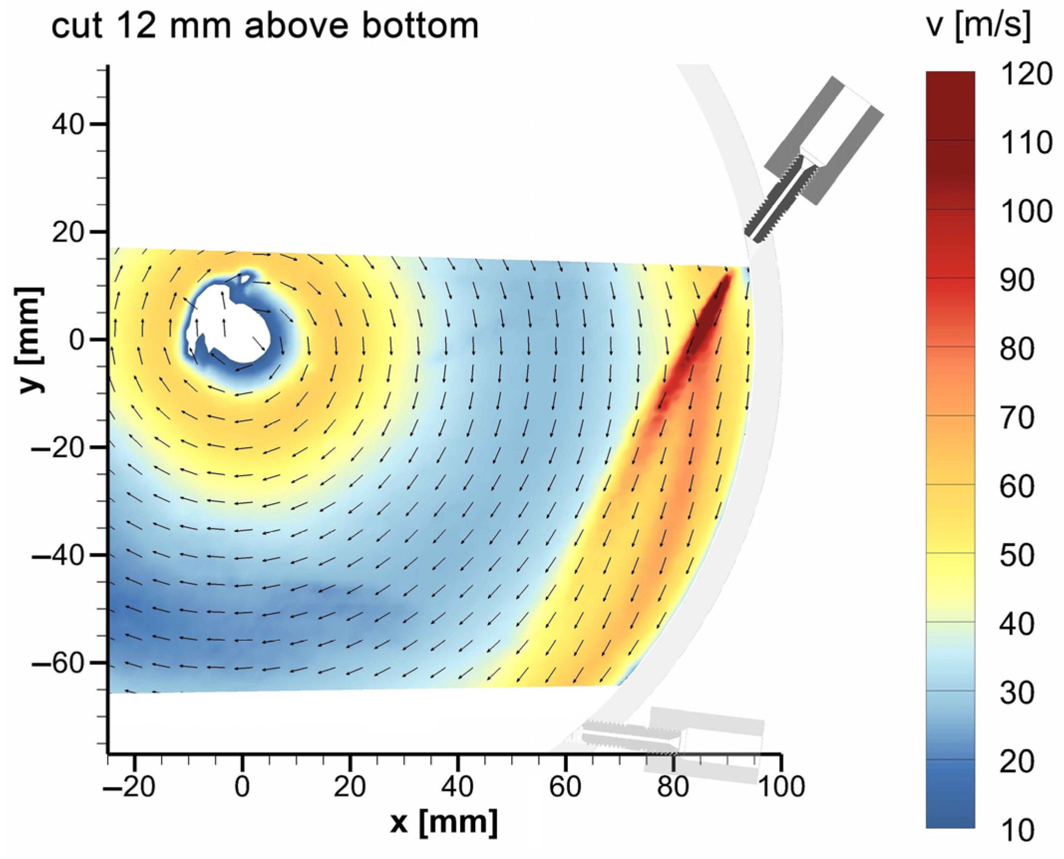 In order to develop an experimental three-dimensional model of the flow, the two-dimensional velocity fields of the unloaded grinding gas are determined at different horizontal levels within the grinding chamber. The height (z) of the levels is varied at intervals of 2 mm, with the measurement commencing 1 mm above the bottom and concluding 1 mm below the cover of the spiral jet mill. In the grinding chamber region between 9 and 15 mm above the bottom, the distance between the levels is reduced to 1 mm due to the presence of the nozzle jet. The two-dimensional data exclusively encompass the flow components in the x- and y-directions, whereas the component in the z-direction cannot be represented. However, since the z-component is significantly lower due to the high tangential spiral vortex flow within the grinding chamber, the measured two-dimensional velocity fields represent a very good approximation of the actual flow conditions.