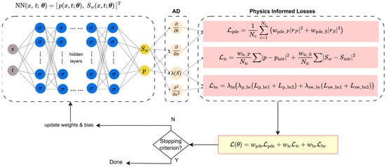 The loss functional for the ML model is significantly more complex, as it must enforce the physics and data constraints for both the pressure and saturation equations. The PINN is trained to minimize the residuals of the two coupled governing equations.