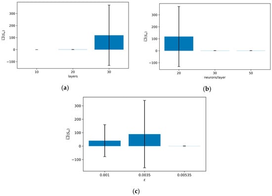 Table 2 highlights the efficiency of the chosen shallow–wide architecture. The baseline model (10 layers, 50 neurons) converged in approximately 257 s with a low saturation error ). In contrast, deeper networks (30 layers) exhibited severe training instability. For example, the 30-layer, 30-neuron configuration terminated after only 1355 iterations with a high error (1.35), indicating a failure to converge. Even when 30-layer models did train for longer durations (e.g., the 30-layer, 20-neuron case took 318 s), they yielded errors an order of magnitude higher than the shallower baseline. This confirms that for the Muskat–Leverett system, representational capacity is better added via width (neurons) rather than depth.