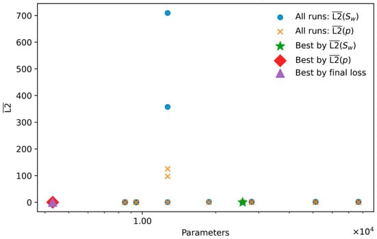 The role of artificial diffusion follows the same logic, effectively serving as a control on the trade-off between numerical stability and physical fidelity. Larger values (e.g., stabilize convergence across hyperparameters but result in consistently higher saturation errors; in this regime, the artificial numerical diffusion begins to overshadow the physical capillary forces, leading to an artificially smeared, non-physical front. Conversely, smaller values (e.g., ) theoretically allow for a sharper recovery of the front but invite severe optimization failures, as the network struggles to resolve high-frequency spectral components without sufficient regularization. The observation that attains the best saturation accuracy suggests it represents the empirical vanishing viscosity limit—sufficient to dampen gradient noise without dominating the global transport dynamics defined by the physical pressure–saturation coupling. The scientifically relevant criterion, therefore, is not the final loss value but the out-of-sample reconstruction of the front, hence selecting by rather than by the composite training objective.