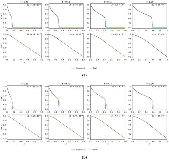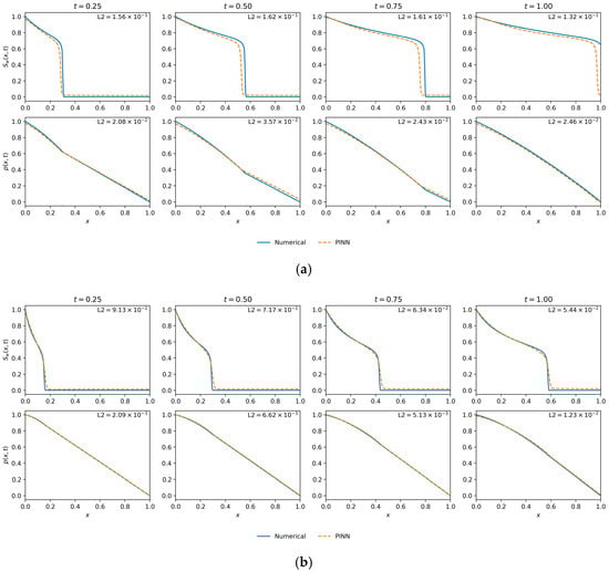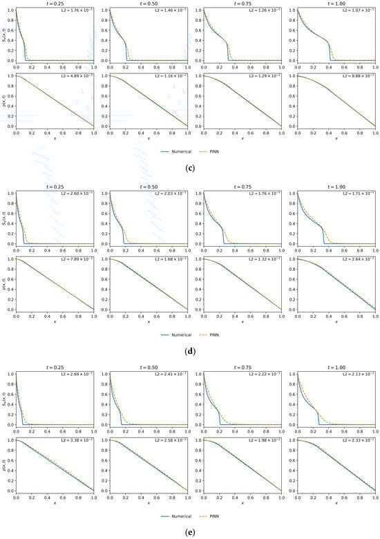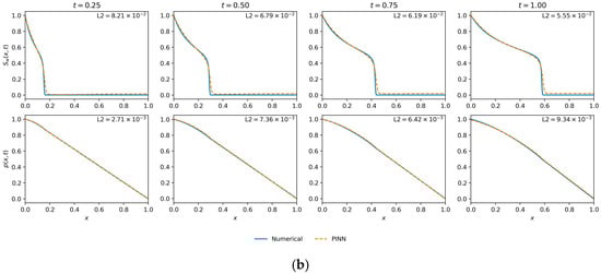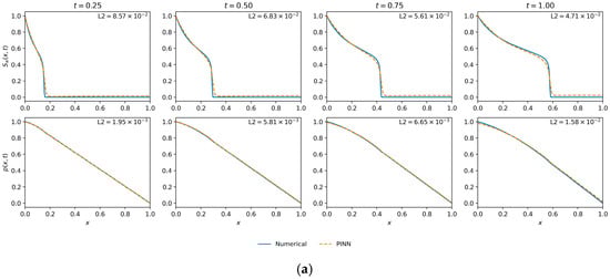 Mobility Ratio () was fixed at 3.0 and all weights () are set to 1.0. This experiment used (per condition) and , which is in line with common PINN baselines that employ data points and collocation points for 1D time-dependent PDEs [21,48,49].
