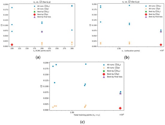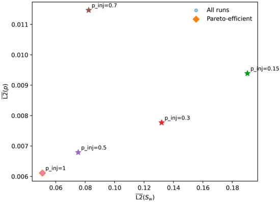 The complexity of the underlying physics influenced the optimizer’s convergence rate. In the injection pressure sensitivity study (Table 5), the training times for the dense models ( = 50,000) ranged between 874 and 1174 s (approx. 15–20 min). Notably, the most physically “stiff” cases (e.g., lower injection pressure ) required more time (174 s) and iterations (21,000) compared to the convection-dominated case (906 s, 15,846 iterations), reflecting the difficulty of resolving broad capillary-diffusive tails.