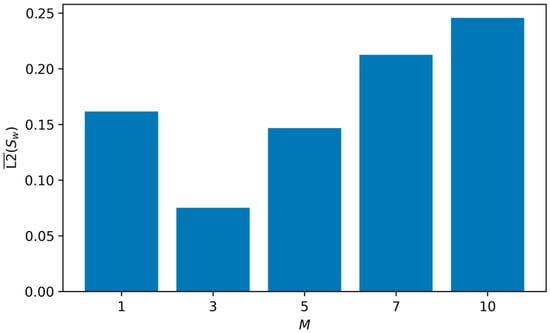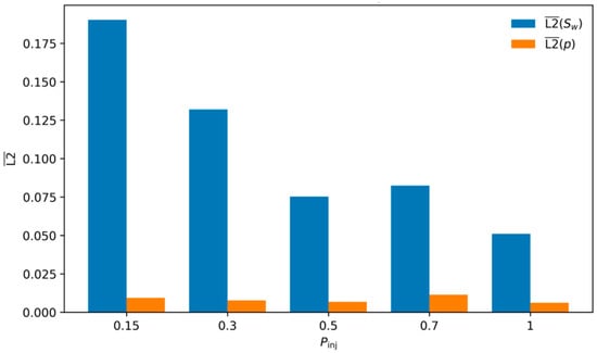 By contrast, sweeping the injection pressure yields a monotone improvement in saturation accuracy as increases. Superficially, this may appear inconsistent with the high- degradation; both sharpen the front. Superficially, this may appear inconsistent with the degradation seen at high M, as both scenarios sharpen the front. However, the physical mechanism differs. Increasing creates a larger global pressure drop, resulting in higher Darcy velocities and a stronger advective drive throughout the domain. While this theoretically steepens the saturation front, the strong, non-zero pressure gradients provide a robust supervisory signal during backpropagation. The network receives unambiguous directional information for the flux, effectively improving the signal-to-noise ratio of the loss gradients and preventing the optimization stagnation often observed in low-gradient, diffusion-dominated regimes. Thus, increasing produces a front that is sharper yet better conditioned from the optimizer’s perspective.