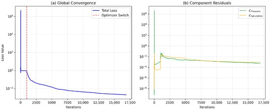 Convergence history of the baseline PINN (M = 3, 10 layers, 50 neurons). (a) Global Convergence: The total loss (log scale) shows the distinct transition from the exploratory Adam phase to the high-precision L-BFGS phase (red dashed line). (b) Component Residuals: The decomposition of the PDE loss confirms that both pressure and saturation residuals are minimized simultaneously and remain well-balanced throughout the optimization.