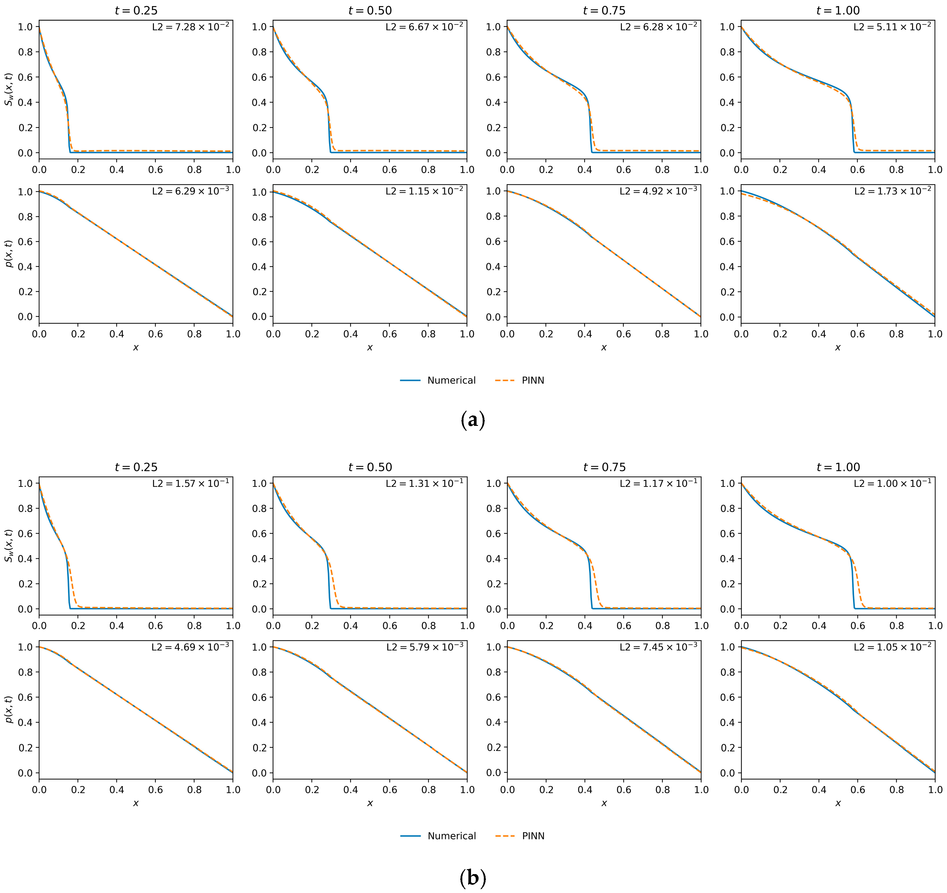) showcases the optimal case. The PINN solution is in near-perfect agreement with the numerical reference for both saturation and pressure, validating its high fidelity in this balanced regime.