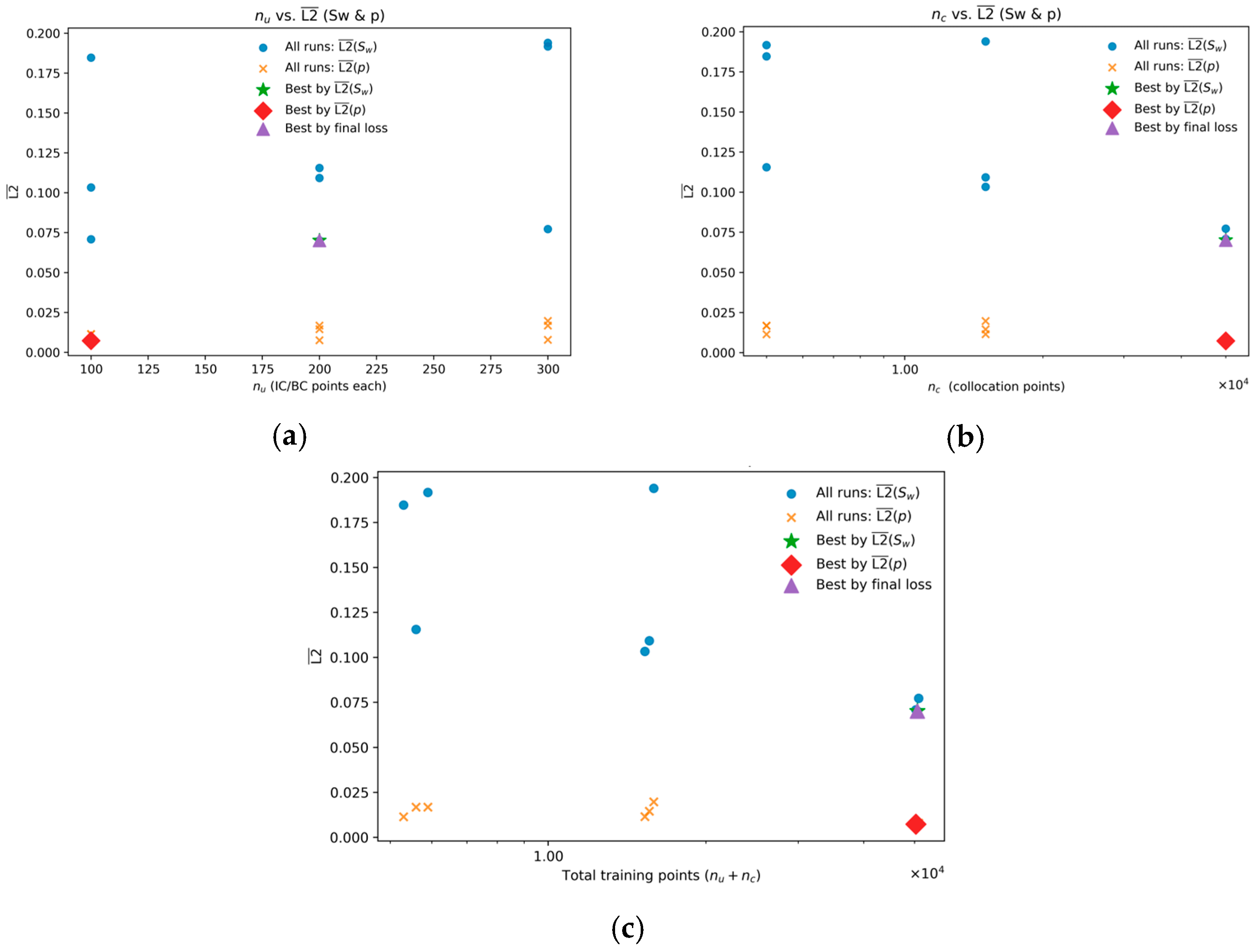 The factorial study on sampling density isolates the true lever: the number of interior collocation points overwhelmingly controls accuracy, whereas the number of boundary/initial data points exerts a weaker, noisy effect once minimal constraints are satisfied. As increases from 5000 to 50,000, the saturation error drops by roughly a factor of two, while the pressure error remains uniformly low across the board. This is exactly what a physicist would predict. In a problem where the interior PDE is the dominant source of information, and where the target structures are fronts rather than smooth harmonic fields, blanketing the space-time domain with residual enforcement is the only way to reduce aliasing of the conservation law.