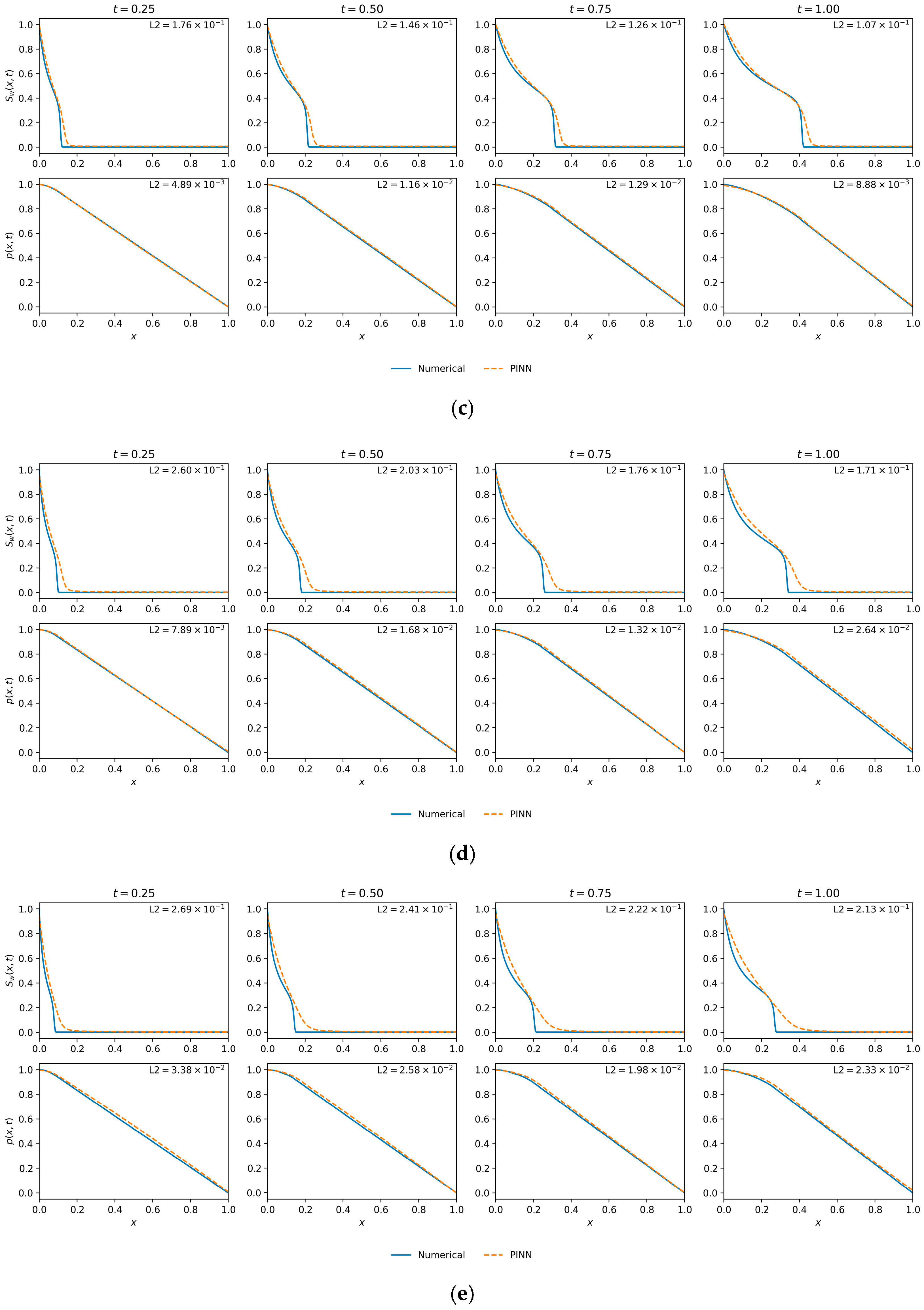 Taken together, the results delineate a coherent recipe for learning the coupled Muskat–Leverett dynamics with a single shared network for and (considering capillarity): enforce the physics densely, favor shallow–wide architectures, and regularize just enough to negotiate stiffness without erasing the front. The baseline numerical references (IMPES) make the target unambiguous, and the relative L2 metrics keep the assessment tied to physical fidelity rather than internal optimization surrogates. Within this frame, the evidence points to a model that is demonstrably accurate on pressure and whose ultimate difficulty lies in reconstructing the saturation front across regimes.