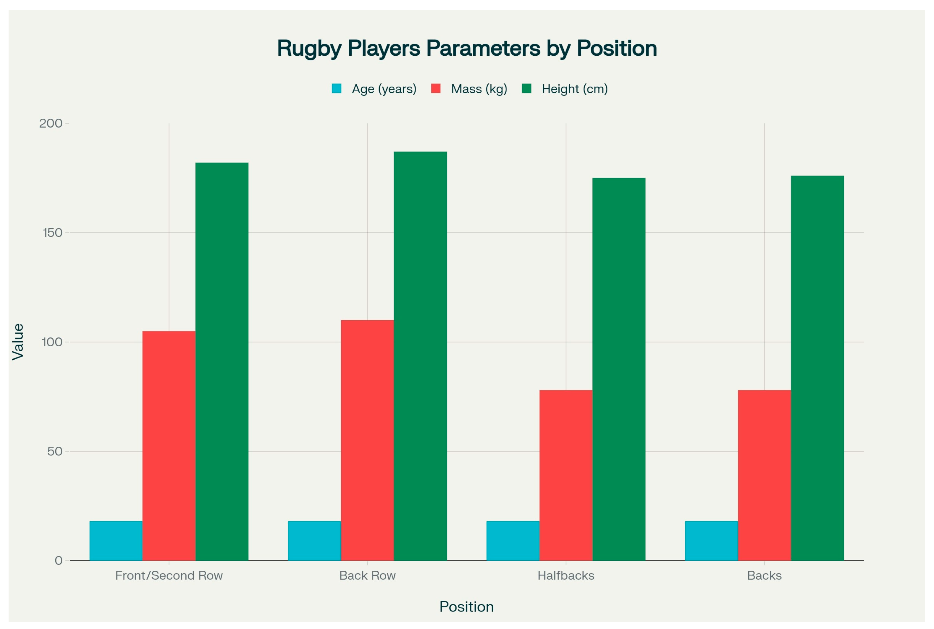 Backs (6 players): Average age 18.66 ± 1.21 years, average body mass 77.67 ± 6.68 kg, and average height 178.16 ± 1.47 cm.