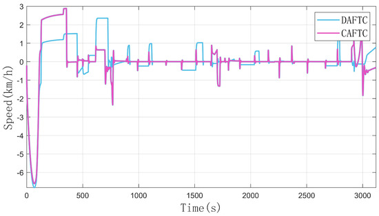The situation where the actuator efficiency of each carriage during train operation decreases and is inconsistent, representative of typical actuator faults such as traction converter thermal derating, is set, and a comparative simulation is carried out between the DAFTC proposed in this paper and CAFTC. Figure 2 shows the speed-tracking trajectory diagrams of DAFTC and CAFTC. Figure 3 shows the corresponding speed-tracking errors of the two controllers. A transient speed-tracking error is observed during the initial traction phase. This is because actuator faults, saturation limitations, and the need for a certain time to adjust the parameters through adaptive control lead to an increase in the train’s error in a short time, but it can converge quickly. When the actuator efficiency is low and inconsistent, the train’s speed-tracking error increases significantly, but it will also converge to a certain range subsequently.
