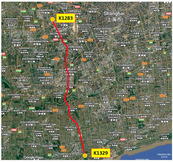 This study uses data from a freeway section in Shanghai, China. The freeway section was 45 km long with a maximum speed limit of 100 km/h. Considering the differences in roadside facilities, traffic flow conditions, and crash distribution characteristics between the two directions of the freeway, the analysis units were divided separately for each direction. Data on traffic crashes, highway geometric characteristics, and operational parameters were collected for the years 2023 and 2024. Figure 1 shows a map of the freeway section examined in this study, including the alignment of the freeway and the start and end kilometer posts.