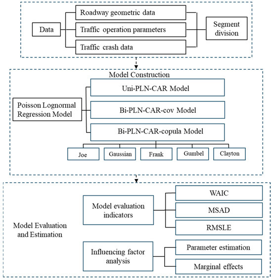 To address the over-dispersion of crash data, we adopted the Poisson lognormal regression model (PLN) as the base model and incorporated a CAR term to capture spatial correlation among different segments. Given the observed site-level correlation between rear-end and sideswipe crashes occurring within the same segment, i.e., site correlation, we further developed bivariate safety analysis models using two approaches, including one based on multivariate jointly distributed residuals and another based on copula functions. Specifically, the following models were established sequentially: the PLN model, the univariate PLN CAR Model (Uni-PLN-CAR), a bivariate PLN-CAR model based on the variance-covariance of jointly distributed residuals (Bi-PLN-CAR-cov), and a bivariate PLN-CAR model based on copula functions (Bi-PLN-CAR-copula). The overall modeling and evaluation framework is illustrated in Figure 4.