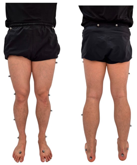 A three-dimensional motion capture system (Vicon MX-T20, Oxford Metrics, Oxford, UK) with six infrared cameras was used to record kinematic data at a sampling rate of 100 Hz, while ground reaction forces were collected at 1000 Hz using an AMTI OR6-7 force plate (Advanced Mechanical Technology Inc., Watertown, MA, USA). The force plate has a measurement capacity of ±5000 N with an accuracy of <0.1% full scale, providing high-fidelity kinetic data for subsequent inverse dynamics calculations. Sixteen reflective markers (14 mm diameter) were bilaterally attached to anatomical landmarks according to the Plug-in Gait lower-body model, including the anterior superior iliac spine (ASIS), posterior superior iliac spine (PSIS), mid-lateral thigh, lateral femoral epicondyle, mid-shank, lateral malleolus, second metatarsal head, and calcaneus. Anthropometric variables (stature, body weight, leg length, knee width, and ankle width) were measured using a standard tape measure and caliper, and the values were entered into the Plug-in Gait model for segment parameter estimation.