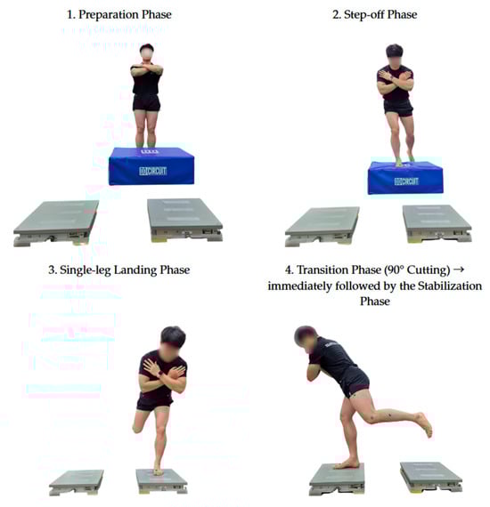 However, previous biomechanical studies have primarily focused on simplified tasks, such as bilateral drop landings [7]. In actual sports scenarios, landing is typically followed by multidirectional movements involving vertical, horizontal, and rotational forces [8]. These complex loads challenge the hip, knee, and ankle joints, and insufficient adaptation may lead to a loss of coordination, postural imbalance, or acute injury [9,10]. Moreover, athletes with ankle instability exhibit prolonged stabilization times and altered center of pressure (COP) trajectories during cutting maneuvers, reflecting impaired postural control [11,12,13,14,15,16]. Therefore, sport-specific biomechanical studies are needed to investigate joint loading and stability during post-landing directional changes.