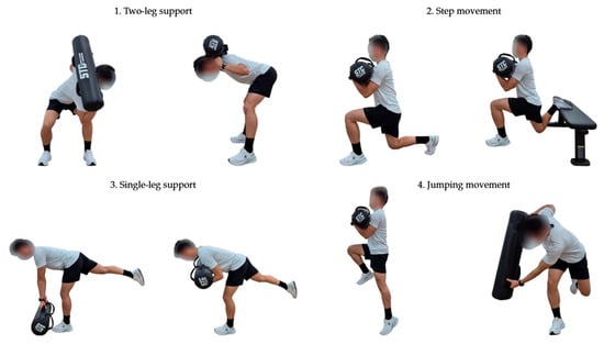 The program was designed as a progressive sequence emphasizing gradual increases in movement complexity and instability, rather than external load magnitude. Exercise progressions included bilateral stance, locomotor tasks, single-leg stance, jumping and acceleration/deceleration drills, and directional changes. Participants in the experimental group performed all exercises using a water-filled waterbag, as illustrated in Figure 4.