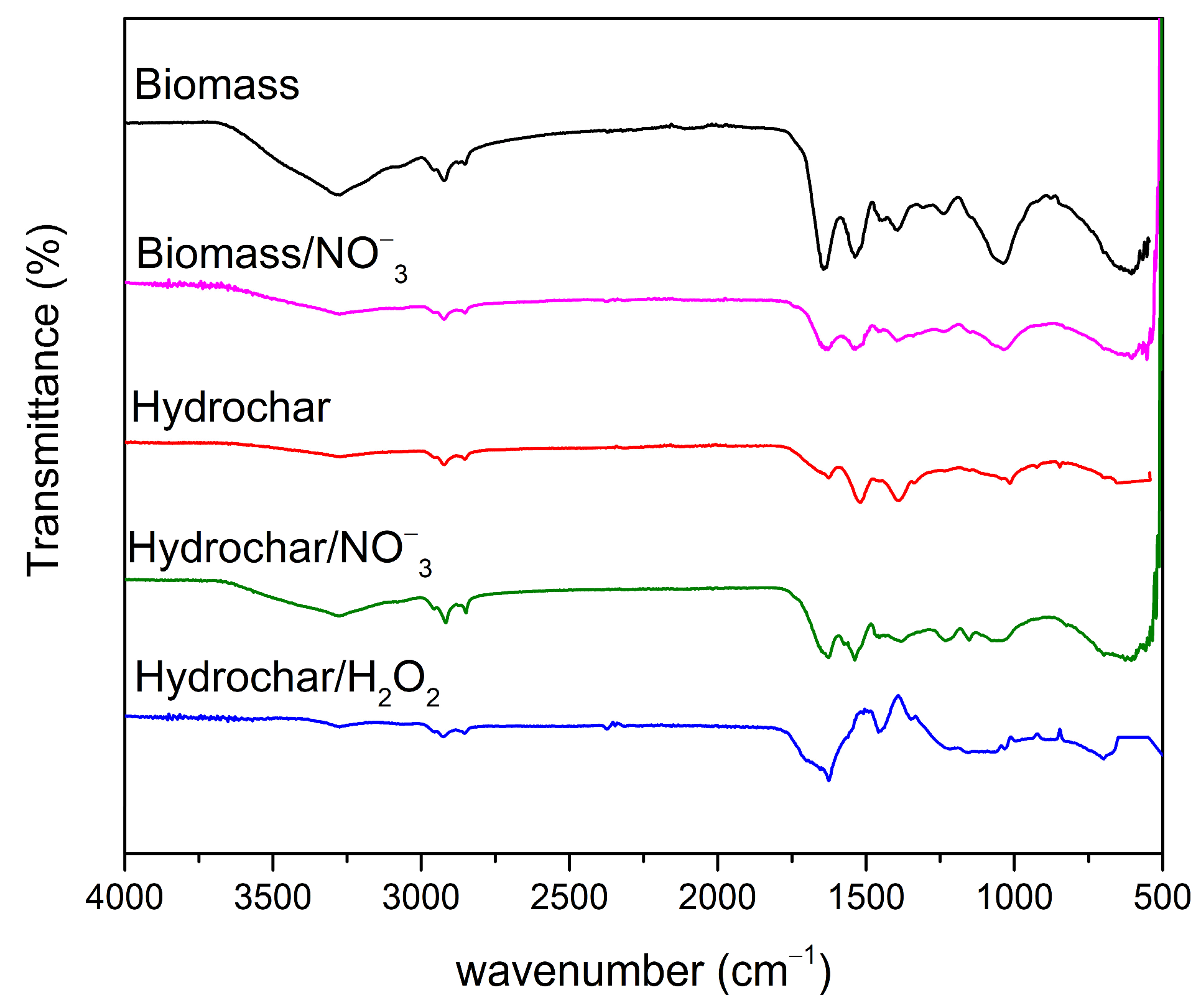 - Adesemuyi, M.F.; Adebayo, M.A.; Akinola, A.O.; Olasehinde, E.F.; Adewole, K.A.; Lajide, L. Preparation and Characterisation of Biochars from Elephant Grass and Their Utilisation for Aqueous Nitrate Removal: Effect of Pyrolysis Temperature. J. Environ. Chem. Eng. 2020, 8, 104507. [Google Scholar] [CrossRef]