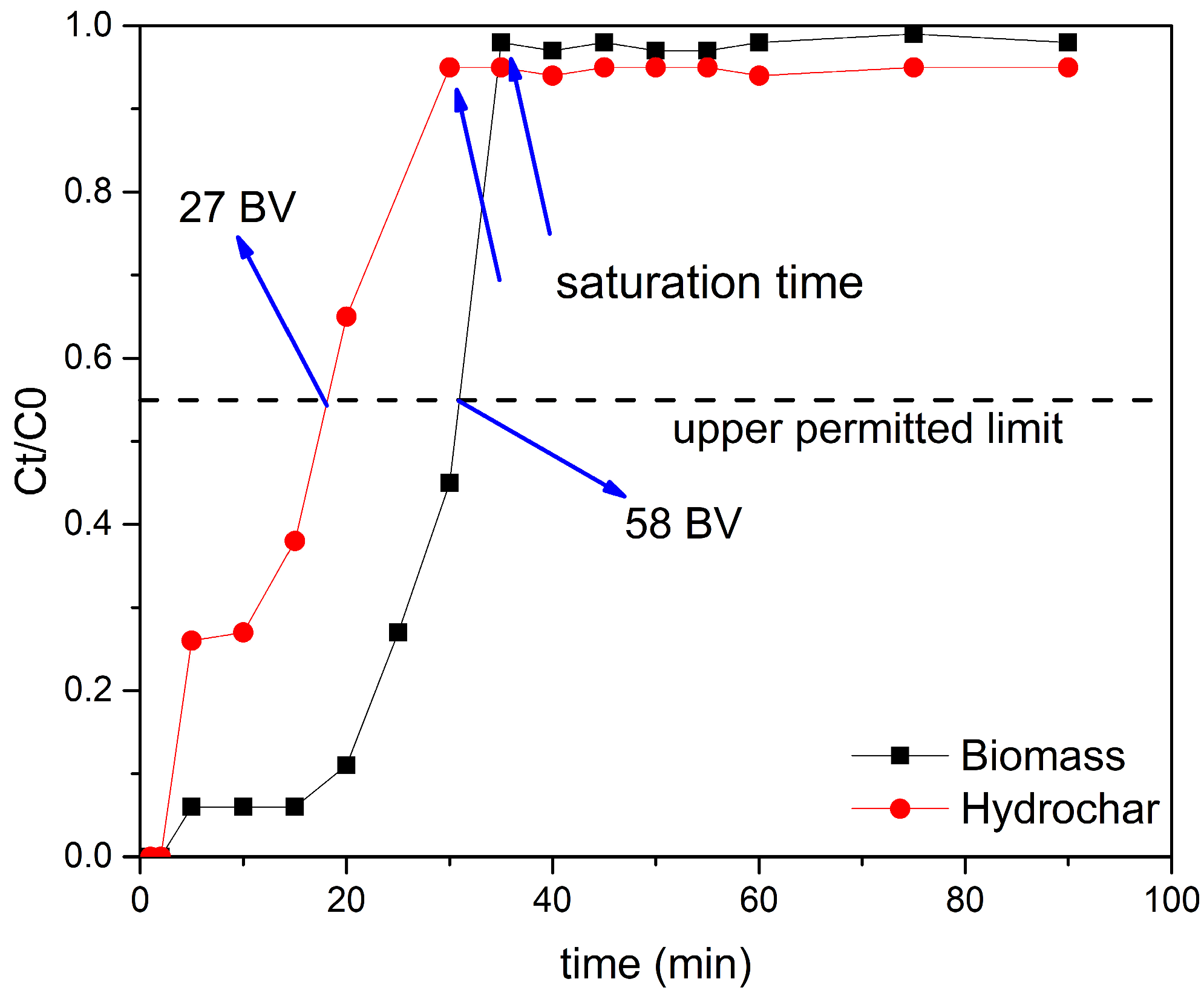 - Continuous flow implementation. In fixed-bed columns, the biomass treated 58 bed volumes of influent to the 11.3 mg N L−1 nitrate-N threshold, compared with 27 bed volumes for the hydrochar at the same operating conditions. This outcome matches the batch evidence and reflects a more slowly advancing mass-transfer zone and a higher dynamic capacity for the native material.