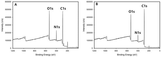 XPS analysis results are shown in Figure 3. According to the survey analysis, three typical C, N, and O peaks were observed (Figure 3A,B). From the deconvolution based on high-resolution XPS spectra, Figure 3C,D reveal that the O–C=O peak at 288.5 eV, previously observed in betaine hydrochloride, disappeared, and a new peak was detected at 287.5 eV. This signifies the formation of a C=N bond. Furthermore, the increase in C–C bond intensity suggests that the overall chain length of the CBCDs was extended by residual moieties. In contrast, the C–O bond at 285.5 eV showed negligible change in binding energy in both betaine hydrochloride and CBCDs, indicating no significant alteration during the synthesis process. In Figure 3E, a peak characteristic of quaternary ammonium nitrogen (N+) in betaine hydrochloride appeared at 401.8 eV. Conversely, in Figure 3F, the 401.8 eV peak decreased, and a new peak corresponding to the C=N bond increased at 399.5 eV. This, in conjunction with the previous FTIR results, suggests that the C=N bond was formed as some methyl groups (CH3) attached to N+ in betaine hydrochloride were detached through demethylation. The reduction in the intensity of the 401.8 eV peak further supports this. In the O1s spectrum shown in Figure 3G, the carboxyl group oxygen peak of betaine hydrochloride was observed at 531.5 eV. However, in Figure 3H, the 531.5 eV peak disappeared, and a new peak corresponding to the C–O bond appeared at 530.0 eV. Consistent with the earlier N1s results, this implies that the original C=O bond oxygen site changed with the formation of the C=N bond.