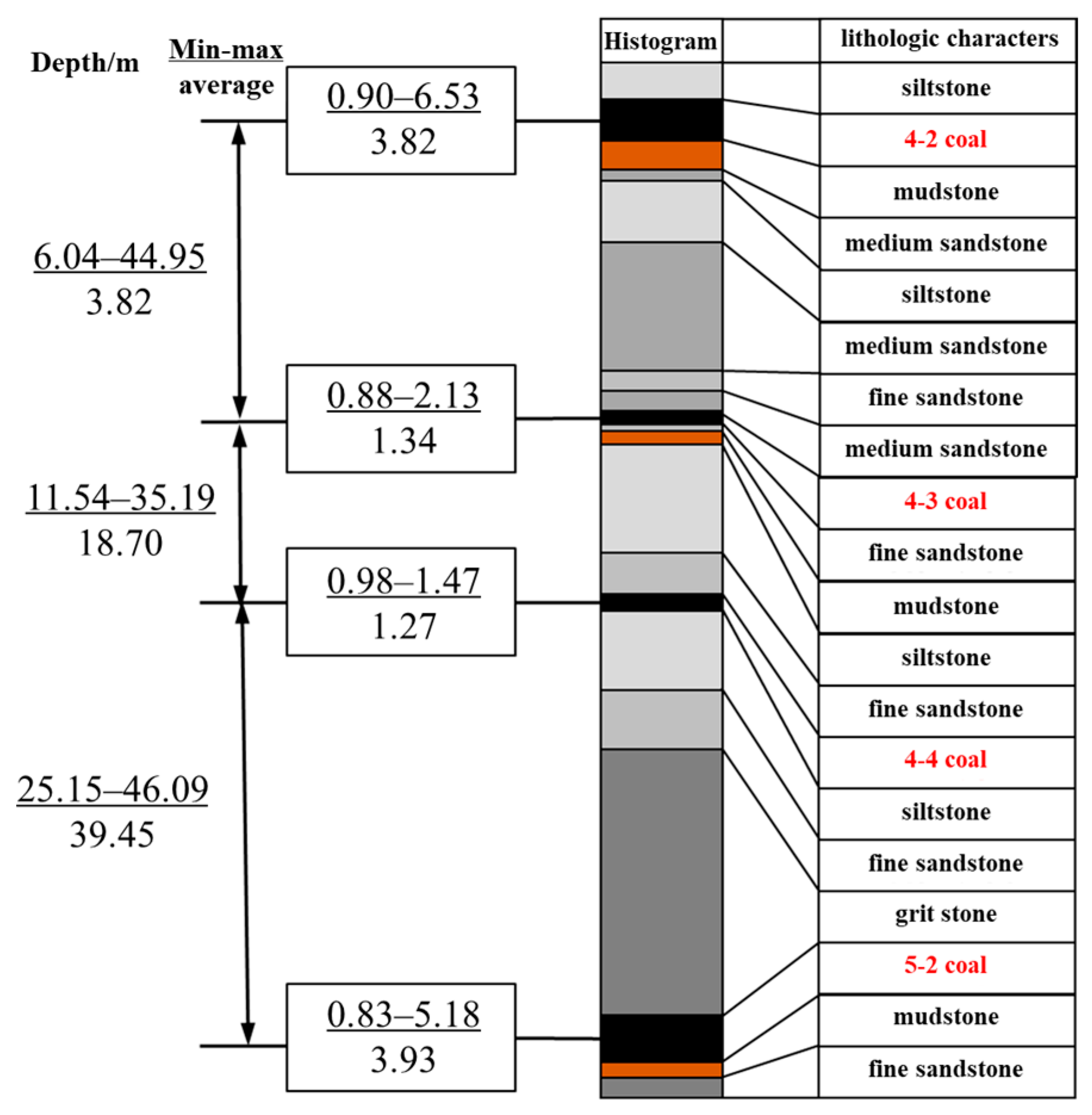 Figure 4). This phenomenon is caused by the collapse and fragmentation of the borehole wall, developed fractures, increased borehole diameter, and expanded cross-sectional area, which lead to an increase in the long- and short-source distance values. It can be concluded that the top boundary of the fracture zone of this borehole is at a depth of 39.70 m, and the top boundary of the caving zone is at a depth of 146.10 m. Judging from the logging curve, after the mining of the 5-2 coal seam at the location of borehole YBK2, the range of the overlying rock caving zone is 0–14.22 m, the range of the fracture zone is 14.22–116.82 m, and the 4-4 coal seam is located within the fracture zone formed after the mining of the 5-2 coal seam, 17.98 m above the caving zone.